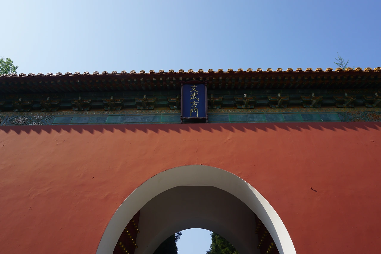 멀리서 봐도 한눈에 알아볼 수 있을 것 같은 붉은 벽과 황금빛 지붕. 저것은 황제의 색이다. 이곳이 바로 명효릉의 정문, 문무방문(文武方门). 이곳을 들어가면 명효릉 묘역으로 진입한 셈이다. 아차, 어떻게 이곳에 오게 된 지를 설명하느라 명효릉이 어떤 곳인지 소개하는 것을 잊었다. 앞서 간략하게 언급한 것처럼 이곳은 명나라 초대 황제 태조 주원장(朱元璋)과 그 부인 효자고황후(孝慈高皇后) 마 씨의 합장 무덤이다. 부인이 먼저 세상을 떠나 이곳에 묻히게 된 것이라 그 이름을 따 효릉이라고 명명되었다. 당시 명나라의 수도인 응천부(应天府)가 난징이었기 때문에 주원장과 그 첫째 아들의 무덤은 난징에 위치해 있다. 그러나 이후 순천부(顺天府, 지금의 북경)로 천도를 하면서 후대 황제들의 무덤은 대부분 북경에 있는데, 이것이 북경에 있는 명13릉이다.