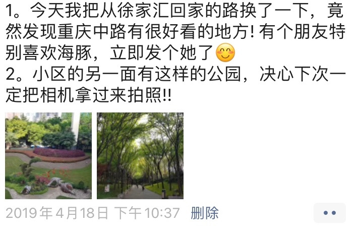 1. 오늘 쉬쟈후이(徐家汇)에서 돌아오는 루트를 좀 바꿔 봤는데, 총칭중루(重庆中路)에서 예쁜 곳을 발견했다. 친구 중에 돌고래를 좋아하는 친구가 있어서 바로 사진을 보내줬다. (*立即发给她了라고 써야 했는데, 오타인 듯..)