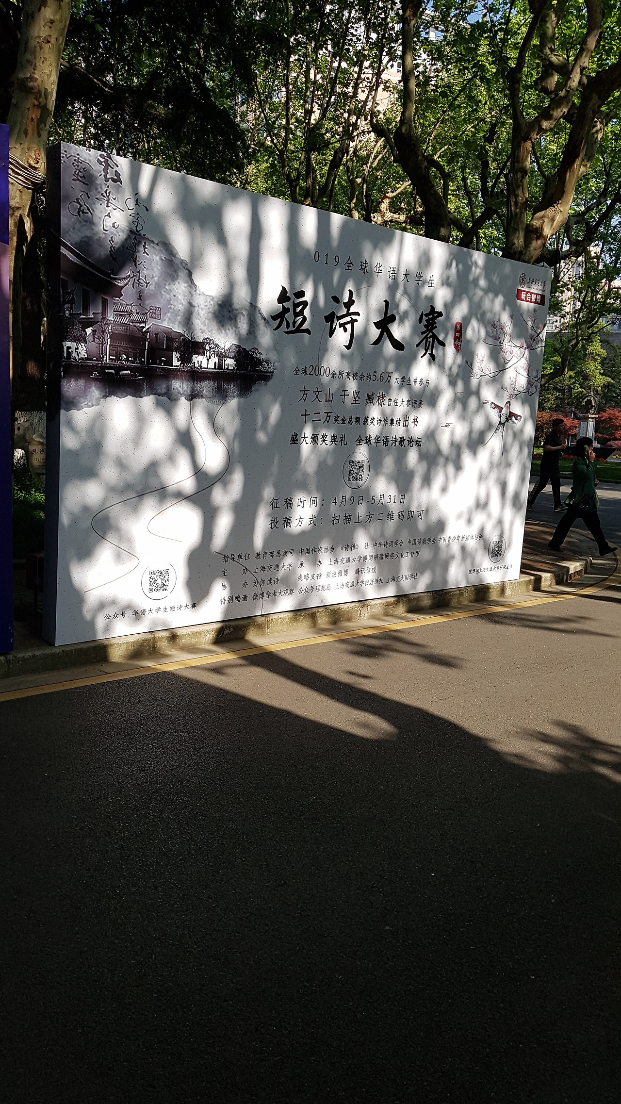 아침 수업을 들으러 강의동으로 가는 길에 재미있는 광고를 발견했다. 시 창작 콘테스트의 광고인데, 전 세계 2천여 곳의 대학에 있는 중국어를 사용하는 학생들이 모두 참여할 수 있는 콘테스트인 것 같다. 아무래도 인문대학 강의동이다 보니 이런 대회의 광고도 하는 모양이다. 문득 한국에서 종종 한문으로 시를 써서 공유해주는 과 후배가 생각이 났는데, 아쉽게도 그 친구는 참여를 못하겠지. 여하튼 이런 방식으로 계속해서 전통적인 시 창작 문화를 계승시키려는 노력은 본받을만한 점인 것 같다.