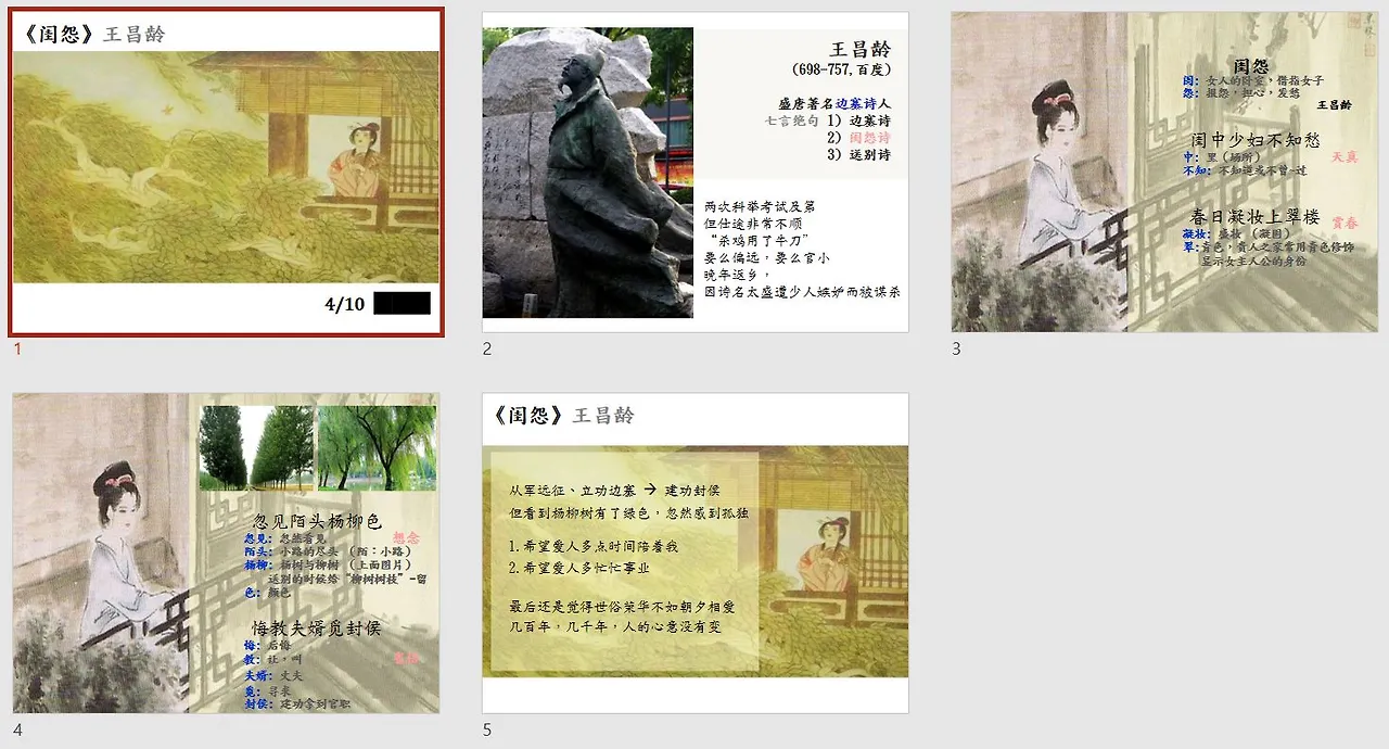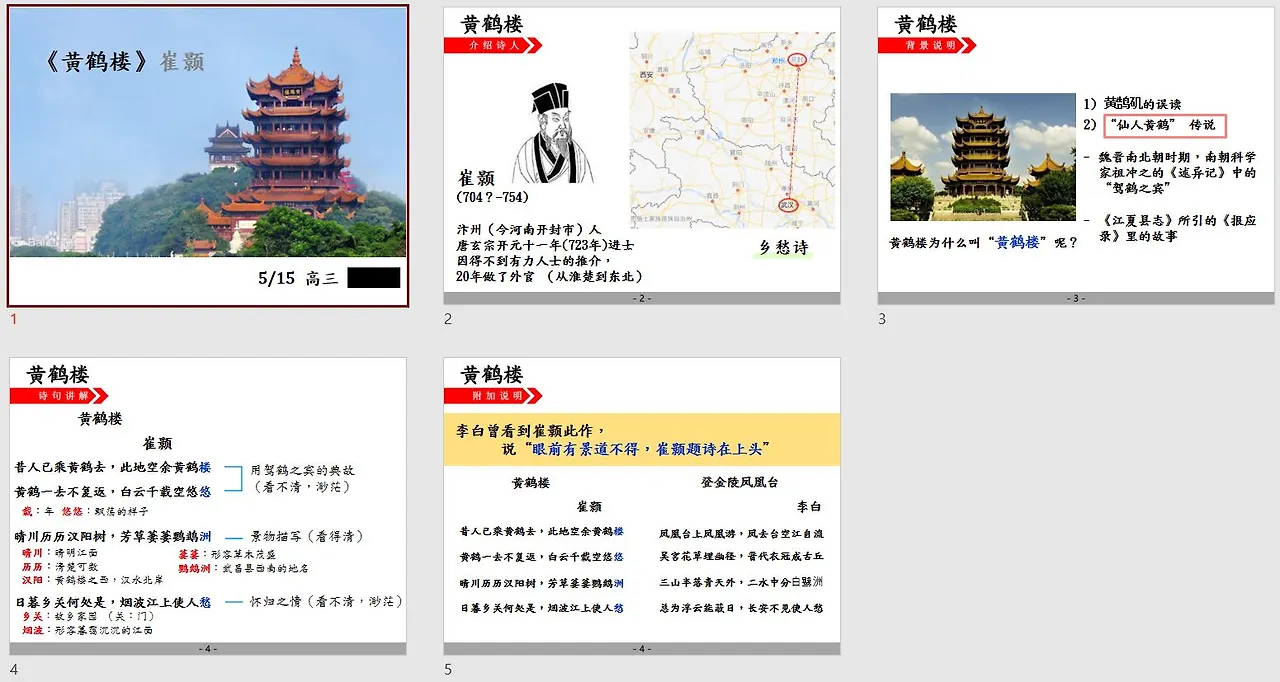 이 수업은 평소 한 시간 반의 수업 시간 중 약 30분 정도를 학생에게 맡기는 수업이었다. 선생님께서 수업이 끝날 때쯤 다음 시간에 다룰 시 3~4수를 알려주시면 학생들이 자발적으로 해설과 감상을 발표할 시를 골라 말씀드리고, 그다음 수업 도입부에 선생님 및 동학들에게 발표했다. 선생님께서는 학생들의 발표가 다 끝난 후에 직접 그 시들에 대해 다시 한번 가르쳐주셨다. 발표를 준비한 학생은 좀 더 심도 있게 시를 이해할 수 있고 다른 학생들은 같은 시의 설명을 반복해서 들을 수 있는 효과가 있었다. 나는 학기 동안 왕창령(王昌龄)의 <규원(闺怨)>, 최호(崔颢)의 <황학루(黄鹤楼)>, 이렇게 두 수를 발표했다.