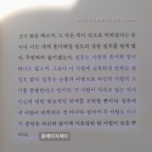 다행인 건 추워서 소름 돋은 게 아니라 책을 읽다 소름이 돋았다는 것이다 오늘 읽고 있던 책은 [크리스티앙 보뱅, 그리움의 정원에서 ]였고 마음에 드는 구절이 있어 여느 때처럼 그 구절이 있는 문단을 사진으로 찍어 두었다 그게 무슨 소름을 부를 일이겠나 소름 돋은 것은 휴대전화의 사진첩에서 1년 전 스토리 알림이 뜨고 그걸 확인하는 순간 때문이었다