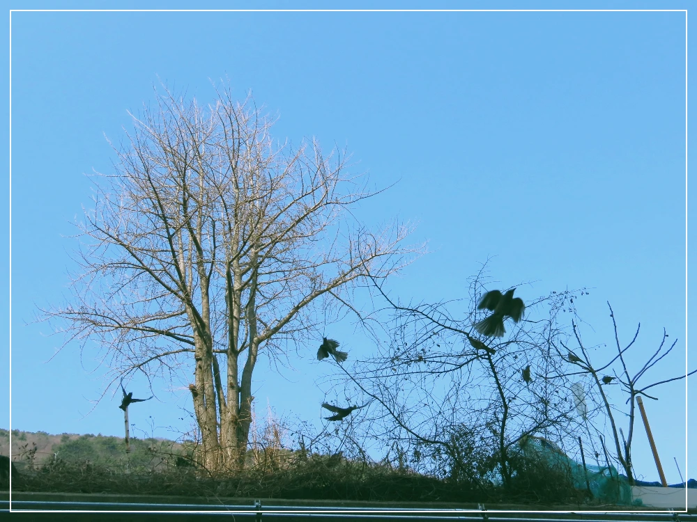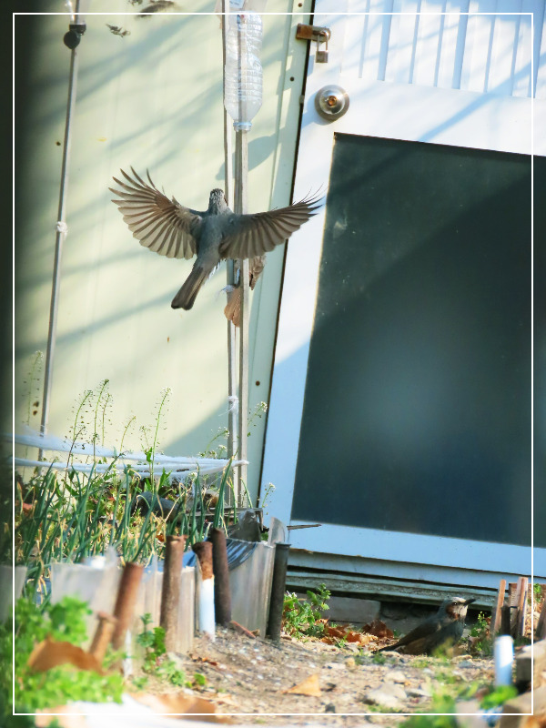 뒷산으로 가는 길에는, 법적으로 허락을 받은 땅인지 아닌지는 모르겠지만 임시로 둘러놓은 그물과 철장, 플라스틱 침대 받침대 같은 것들로 '여기까지는 내 땅' 이라 땅을 나눠 놓은 곳들이 좁은 길을 사이에 두고 있다. 각 각의 땅에는 주인만 드나드는 쪽문이 있고, 그 입구에는 ‘무단침입 금지’ 팻말도 붙어 있지만, 그 사이로 새들은 아랑곳 하지 않고 주인 몰래 무단침입을 했다. 그중에서도 유난히 새가 많이 모여 있는 나무 맞은편에 털석 주저앉아 그들을 가만히 바라보았다.