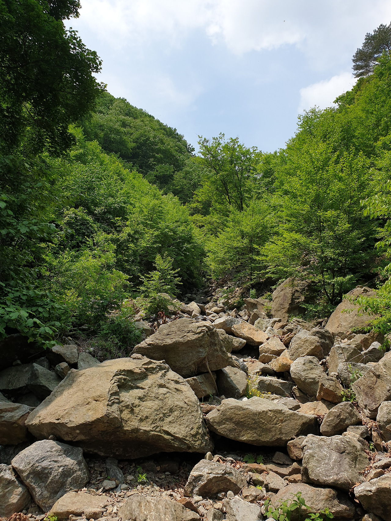 용수동에서 임도로 오르는 계곡오지 분위기가 물씬 풍기는 우거진 숲과 녹색 이끼가 잔뜩 낀 검은색 톤의 각진 너덜들로 형성된 계곡은 물은 좋지만 거칠었다. 특히 계곡 마지막 지점의 형성된지 얼마 안 된 너널지대는 황막하고 위험했다. 이곳과 흡사한 곳이 바로 옆 지역에도 있었다. 용수종에서 도마치 고개로 오르는 중간지점에 적목용소에서 국망봉으로 직접 올라가는 급경사 코스가 있는데, 그 초입에서 무주채폭포까지 가는 계곡이 V협곡처럼 깊으면서 바위들이 날카롭게 각지고 검었다. 편안히 쉴 수 있는 아늑한 분위기가 아니라 한기가 느낄 정도로 음침학고 괴이한 풍경이었다. 하여튼 임도 트레킹에서 이곳 같이 거친 풍경과 접하는 경우는 흔하지 않았다.
