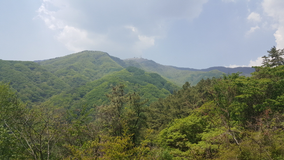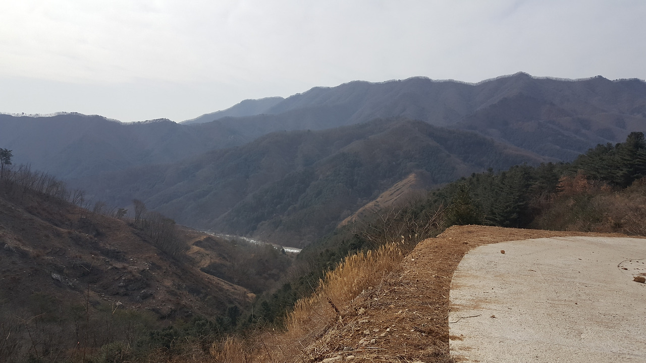두 시간 가까이 남쪽 지능선을 타고 가던 임도가 북쪽으로 방향을 급선회하면서 탁 트인 조망을 보여주기 시작한다. 그때서야 병풍처럼 펼쳐진 화악산 줄기가 한눈에 들어온다. 오늘 임도 중에 가장 높은 곳이다. 임도 트레킹에서 조망을 요구하는 것은 부질없는 짓이지만, 이렇게 생각지도 않은 장쾌한 조망을 선물 받는 경우도 가끔은 있다. 우리는 걸음을 멈추고 파란 하늘에 그려진 능선의 실루엣을 잠시 감상하고 있었다. 능선 너머 익근리에서 시작한 임도가 애기 고개를 넘어 산허리를 휘감아 돌아 남쪽으로 가로질러 가고 있었다. 익근리와 화악리를 잇는 지름길이었다.