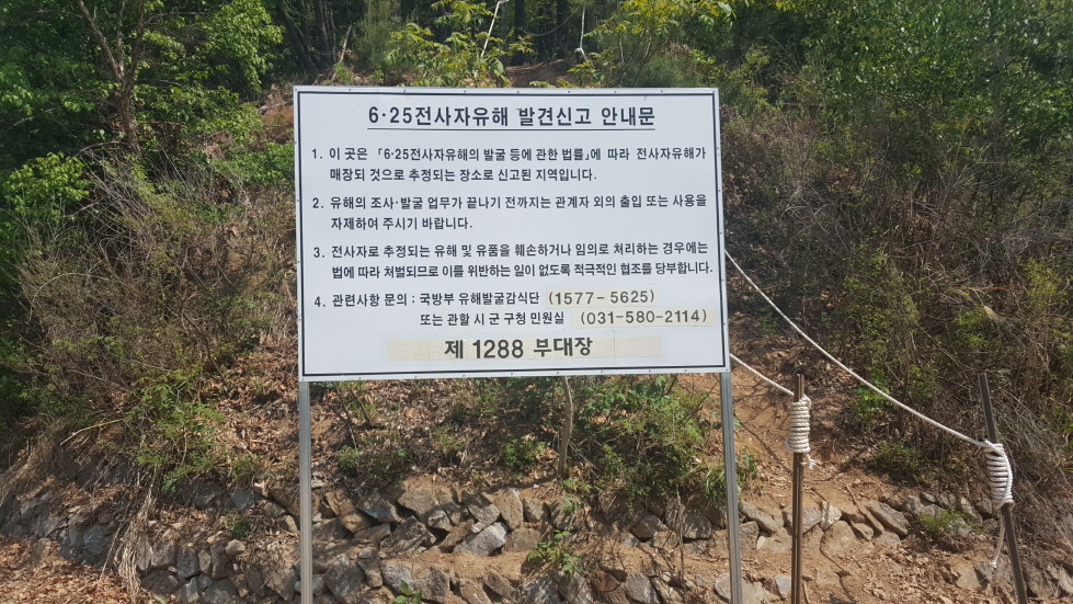 그렇게 기억의 여운을 떨쳐버리지 못하고, 텅 빈 정적 속을 걷고 있을 때 천막 하나가 길옆에 있는 게 보였다. 한국전쟁 전사자 유해 발굴 현장이라는 팻말도 보였다. 주말이어서인지 사람은 보이지 않았다. 천막 옆에 삽과 곡괭이 등 발굴 도구들이 가지런히 탁자에 놓여 있었고, 천막 안을 보려고 했으나 닫혀 있었다.