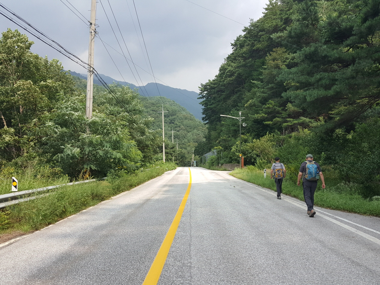 하여튼 우리는 옛길로 내려와 배낭을 추스르고 사명산을 향해 걸었다. 도로는 텅 빈 채 정적에 쌓여 있었다. 살벌한 신도로와는 전혀 다른 길이었다. 꼬부랑길이라는 관광지명으로 명명된 소양강 옛길은 차 한 대 다니지 않는 한적한 도로로 변해 있었다. 대처에서 양구로 오가는 유일한 길이었던 이 도로는 이제 자전거나 모터사이클 족들의 전유물이 되었고 간혹 우리 같은 산객들이 드나드는 통로가 되어 있었다.