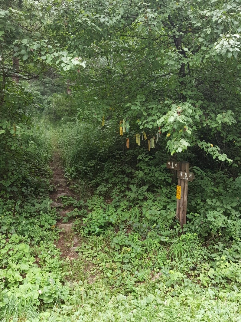2019년 8월 17일 / 마을 구릉에서 본 소양호, 그리고 그 너머 가리산이제 도로 끝에 있는 무량사와 선정사를 지나면 본격적으로 산행이 시작된다. 울창한 숲을 헤치고 20분 정도 수량이 풍부한 계곡을 따라 오르면 드디어 우리가 고대하던 임도에 당도한다. 임도를 가로질러 급경사와 한바탕 격렬하게 씨름을 하면 사명산 정상에 오를 수 있지만 그것은 또 다른 차원의 세계라는 것을 우리는 너무나 잘 알고 있었다. 현재 우리가 가야 할 길은 봉우리가 아니라는 것이다.