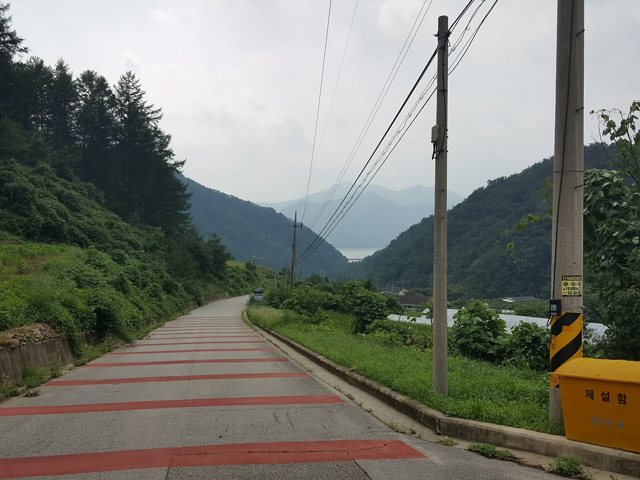 웅진리 마을 입구에서 간단하게 사진을 찍은 우리는 발걸음을 다시 옮겼다. 강원도 산세의 특징은 구릉지가 발달되어 있으며 그 비탈면을 따라 마을이 형성되어 있다는 점이다. 산이 많은 지역이니 자연스러운 현상이었다. 이 마을도 소양호 수면부터 시작된 구릉지는 표교차 300미터 이상 올라가야 끝이 났으며, 마을 도로도 갈 짓 자를 만들지 않고 완만하게 거의 일직선으로 올라가 끝난다.