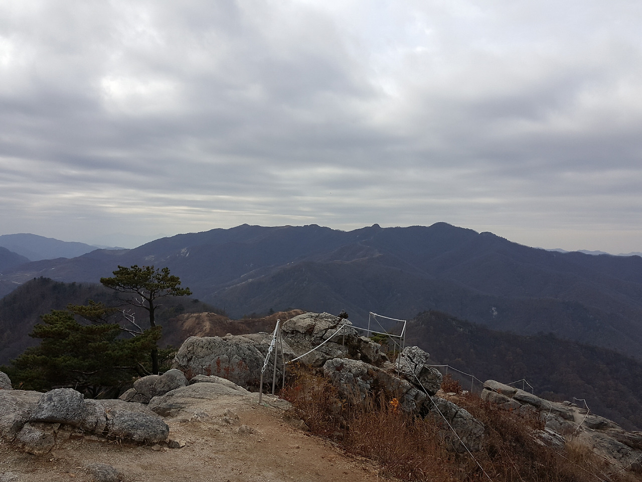 정상에서 내려가는 길은 올라온 능선보다 더 험하고 황량하다. 몇 년 전 산행 도반과 이 능선으로 내려갈 때 비를 동반한 천둥번개가 천지개벽을 하듯 세상을 뒤덮고 있었는데, 그 상황에 적나라하게 노출되어 있던 우리는 바위 아래 몸을 간신히 숨기고 하늘의 노여움에 숨을 죽이고 있었다. 은폐물이 없는 이런 능선에서 천둥번개를 만나는 것은 위험하다는 것을 알지만 그렇다고 선택할 수 있는 방법도 없는 상황이었다. 아무튼 그는 불모지 능선을 지나 드디어 숲길로 들어서서 약사령을 향해 빠르게 하산했다.