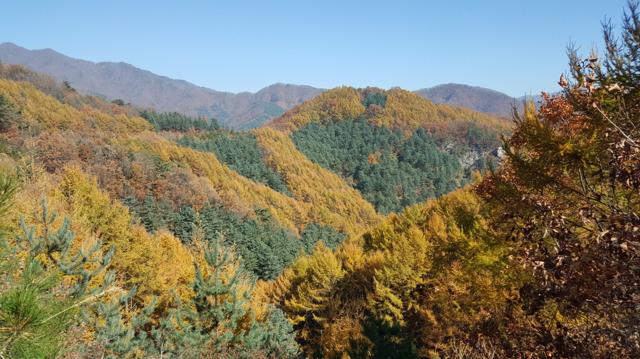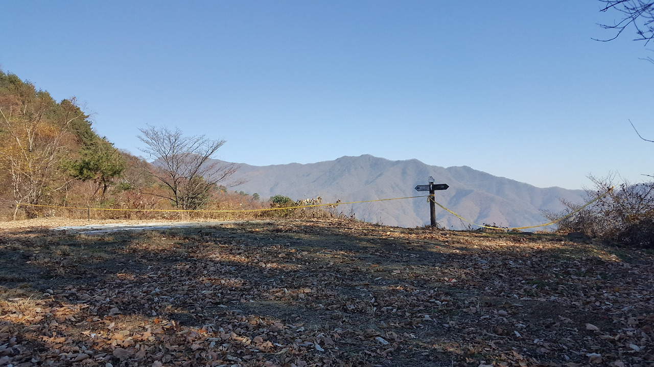 2018년 11월 3일 / 애기고개잠시 동남쪽 방향에 펼쳐진 화악산 지맥 능선을 조망한 후, 다시 9부 능선을 따라 완만하게 이어진 길로 발길을 옮겼다. 그리고 발목이 푹푹 빠지는 가랑잎과 20여분 씨름을 한 나는 드디어 애기고개에 당도했다. 마루금은 넓은 헬기장이며 화악산 중봉에서 시작해 애기봉을 거쳐 수덕산으로 가는 능선 안부에 위치하고 있다. 부근에 있는 명지산이나 화악산처럼 등산객들이 잘 찾지 않는 외진 곳이다. 산에 대한 명성을 따지지 않고 산이 있으면 본능적으로 찾아다니는 덕후급 산악인들이나 오르는 곳이다. 자칭 지맥꾼이라 부르는 부류가 그들이다. 산에 좀 다니다 보면 그런 사람들을 간혹 보게 된다.