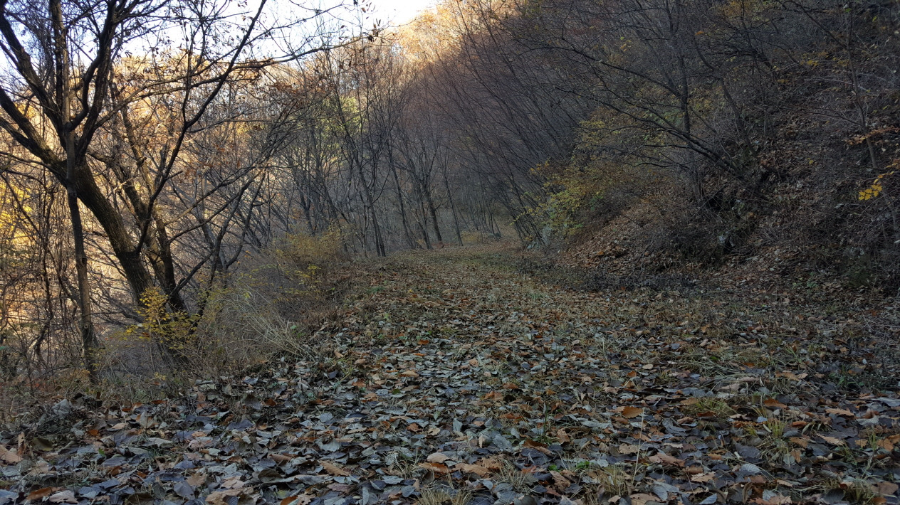 텅 빈 도로를 뒤로 하고 200여 미터 콘크리트 비탈길을 오르면 도솔천사와 고개로 오르는 삼거리가 나온다. 배낭도 추스르고 GPS도 작동시킨 후 솦 속으로 들어가기 시작했다. 늦가을 아침의 차가운 공기가 콧속 깊이 파고든다. 언제나 그렇듯 두터운 정적이 감돌고, 초행이 아닌데도 설렘이 엄습한다. 그리고 태양이 보일만한 시간이지만 사위는 짙은 그림자가 드리워져 있었으며 이슬 맞은 낙엽이 숲길을 수복이 덥고 있었다.