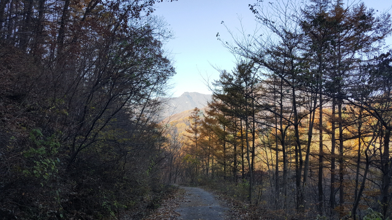 2018년 11월 3일 / 애기고개 마루마루금에서 10여분 내려가면 삼거리가 나온다. 왼쪽 길이 본래의 옛 고갯길이고 오른쪽 길이 내가 가야 할 임도로서 좀 더 자세하게 말하자면 옛 산판길을 확장한 길이다. 이제 본격적으로 임도 속으로 접어들었다. 역시나 마찬가지로 돼지 창자 같이 꼬불꼬불 이어지는 길을 따라 약 두 시간은 가야 화악리 날머리에 도착할 수 있다.