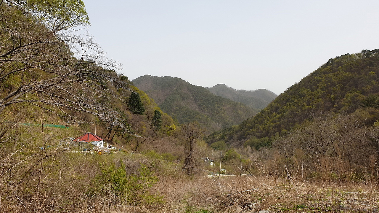 2021년 4월 17일 / 운수고개와 그 고개에서 본 추곡리 얼마나 시간이 흘렀을까, 선정과도 같이, 의식의 전원이 꺼진 채 걷고 있을 때 산길로 빗방울 떨어지는 소리가 들리기 시작했다. 잔뜩 흐렸던 하늘은 일기예보를 비웃듯 가는 빗줄기를 흩뿌리고 있었다. 레인재킷을 입을 정도는 아니었다. 나는 입고 있던 윈드재킷 후드를 뒤집어썼다. 후드를 스치는 빗방울에서 아직도 겨울 기운이 느껴졌고, 줄기차게 걷는 데도 한기가 콧속으로 파고들었다. 나중에 안 사실이지만 설악산에는 그 시간에 폭설이 내렸다고 한다. 비도 차갑고, 땅도 차갑고, 앙상한 나뭇가지들도 아직 온기가 느껴지지 않았다. 하지만 비는 오래 내리지 않았다. 운수령에 도착할 즈음에 빗방울은 슬며시 종적을 감추었다. 그리고 놀랍게도 마지막 남은 찬기를 소멸해버린 듯 곧이어 태양이 하늘에 모습을 나타냈다. 정말 언제 흐렸냐는 듯 파란 하늘이 눈부시게 빛나고 있었다. 나는 고개를 들어 그 햇살을 만끽하며 운수 고개를 내려간다. 봄 햇살이 얼굴에서 화려하게 부서지고 있었다.