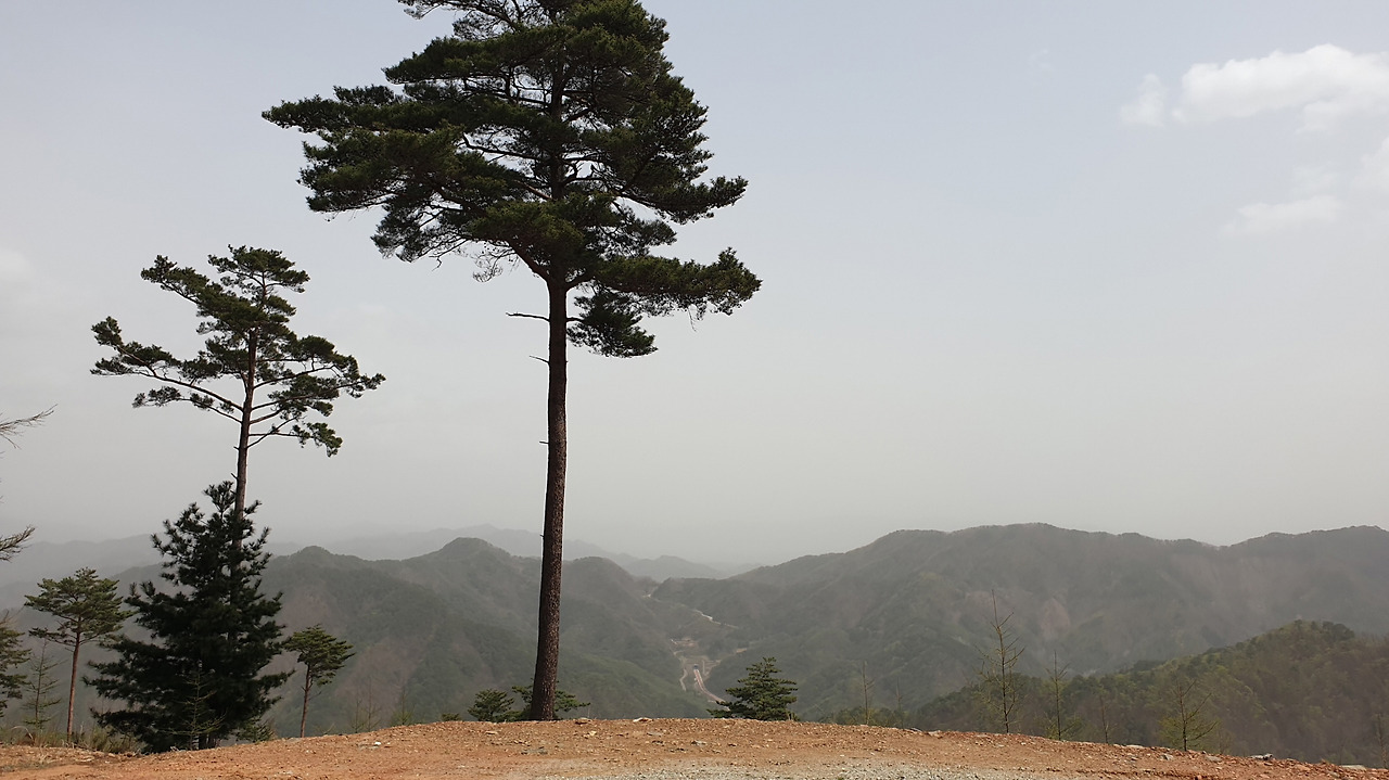 그래도 임도는 나의 불만을 조금은 달래주려는 듯, 1차 목표점인 임도 삼거리와 200여 미터를 남겨놓은 엿가락처럼 길게 늘어진 지점에 도착했을 때 탁 트린 조망을 선사한다. 올라온 노고에 조금의 보답을 받은 나는 애들처럼 금방 입을 헤벌리고 봉우리 부럽지 않은 그 풍광을 만끽한다. 월명천을 사이에 두고 한 시간 반 전에 택시를 타고 지나왔던 월명터널이 바로 보인다. 이 산 중턱에서 보이는 월명리는 정말 고립되어 있다는 사실을 확실하게 증명하고 있다. 외부에서는 물론이고 항공에서도 이곳에 사람이 살만한 곳이라고 보지 못할 것이다.