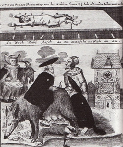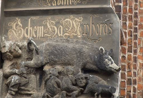 독일어로 유대인 암퇘지라는 뜻이다. 유대인이 돼지 항문에 얼굴을 대고 핥으며 똥을 먹는 조각인데, 지금도 독일 비텐베르크 교회에 가면 그 조각을 볼 수 있다. 비텐베르크 교회뿐만 아니라 독일과 프랑스에 있는 여러 교회에서도 그 조각을 볼 수 있으며 현존하는 그림도 수없이 많이 남아 있다. 유대인은 더럽고 불결하다는 조롱과 멸시의 상징이다. 종교개혁의 루터도 그 조각을 보고 감명을 받아 이렇게 구체적으로 묘사한다. ‘거기에 있는 돼지 새끼와 그것을 핥고 있는 유대인이 있다. 암퇘지 뒤에는 오른쪽 다리를 들어 올리는 랍비가 서있는데 그의 왼손으로 돼지의 꼬리를 잡아당기고 마치 돼지처럼 열심히 꼬리 아래에 있는 탈무드를 본다. 마치 무언가 세밀하고 특별한 것을 읽고 이해하길 원하는 거처럼’ 비텐베르크 교회는 루터가 95개의 대자보를 붙인 바로 그 유명한 교회이다. 당시 독일에서는 유덴자우에 대한 연극도 동네에서 많이 공연되었다고 한다.
