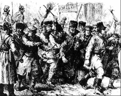 하지만 19세기 차르 시대에 유대인은 서유럽에서와 같은 이유로 슬라브 민족에게 시기와 미움을 사면서 반유대주의가 뒤늦게 형성된다. 1881년 차르 알렉산드로 2세가 암살당하는 사건이 일어나는 데, 배후에 유대인이 개입되어 있다는 헛소문이 퍼지면서 200여 개의 유대인 마을이 피습당하고 상당한 재산상의 피해를 입는 폭동이 일어난다.
