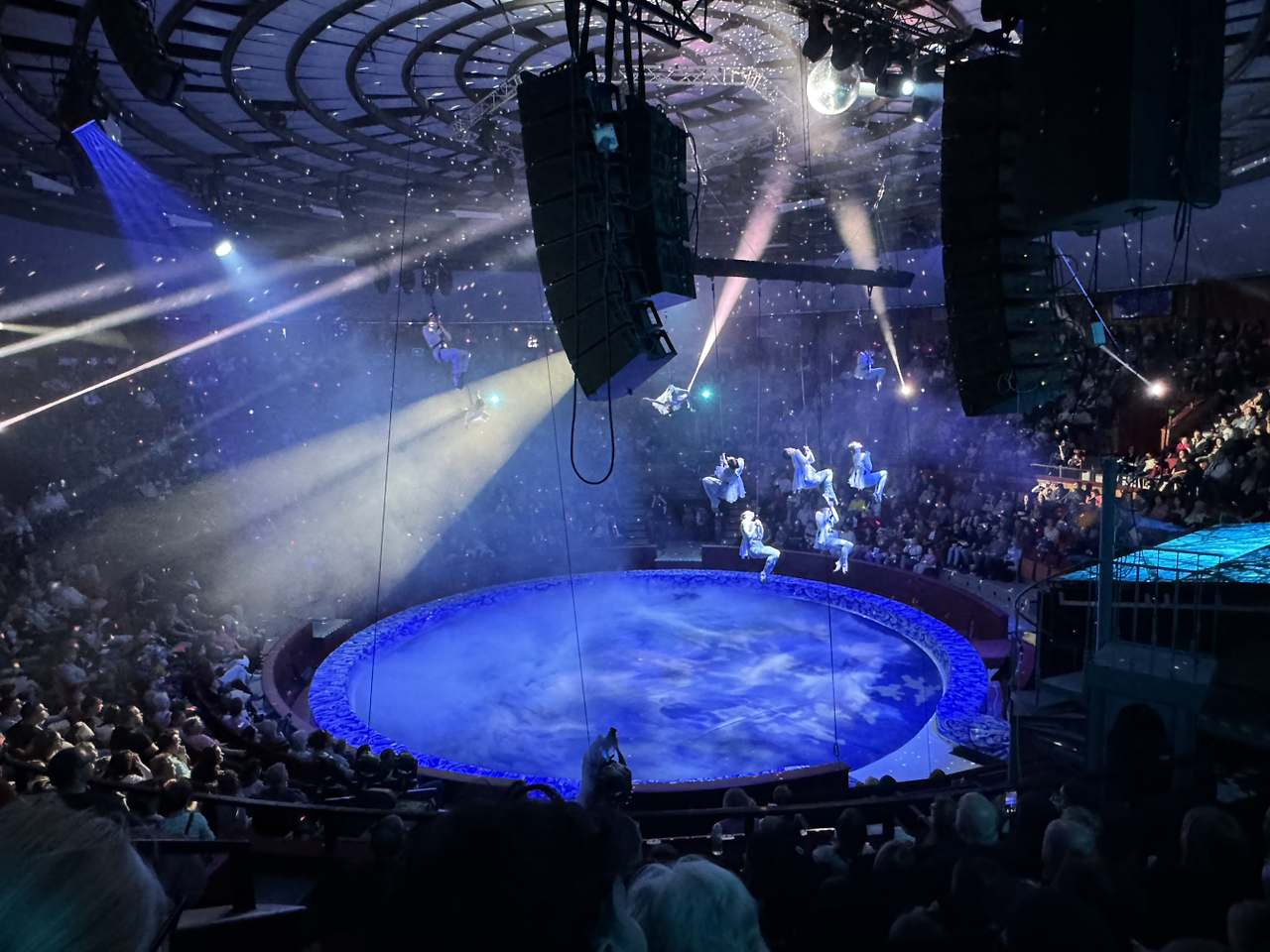 거꾸로 누워서 방석을 돌리거나 다른 물건들을 발로 손으로 돌리는 그 공연 자는 나중에 개 썰매를 끄는 공연 때도 등장한다. 이 서커스 안에서 가장 핵심적인 인물일 것 같은 느낌이 들었다. 중국 여자 아이들과 중국 무술가들의 공연도 인상적이었다. 주변에서 춤을 추는 사람들의 동작이 약간 발레 느낌이 들어서 서커스라기 보단 발레 공연을 보는 듯한 느낌도 들었다. 인터미션 10분을 두고 앞뒤로 2시간 넘는 공연이었는데 공연자들도 최선을 다했고 또 관객들도 매 공연이 끝날 때마다 서로 박자를 맞춰 박수를 치면서 한껏 분위기를 돋운다.