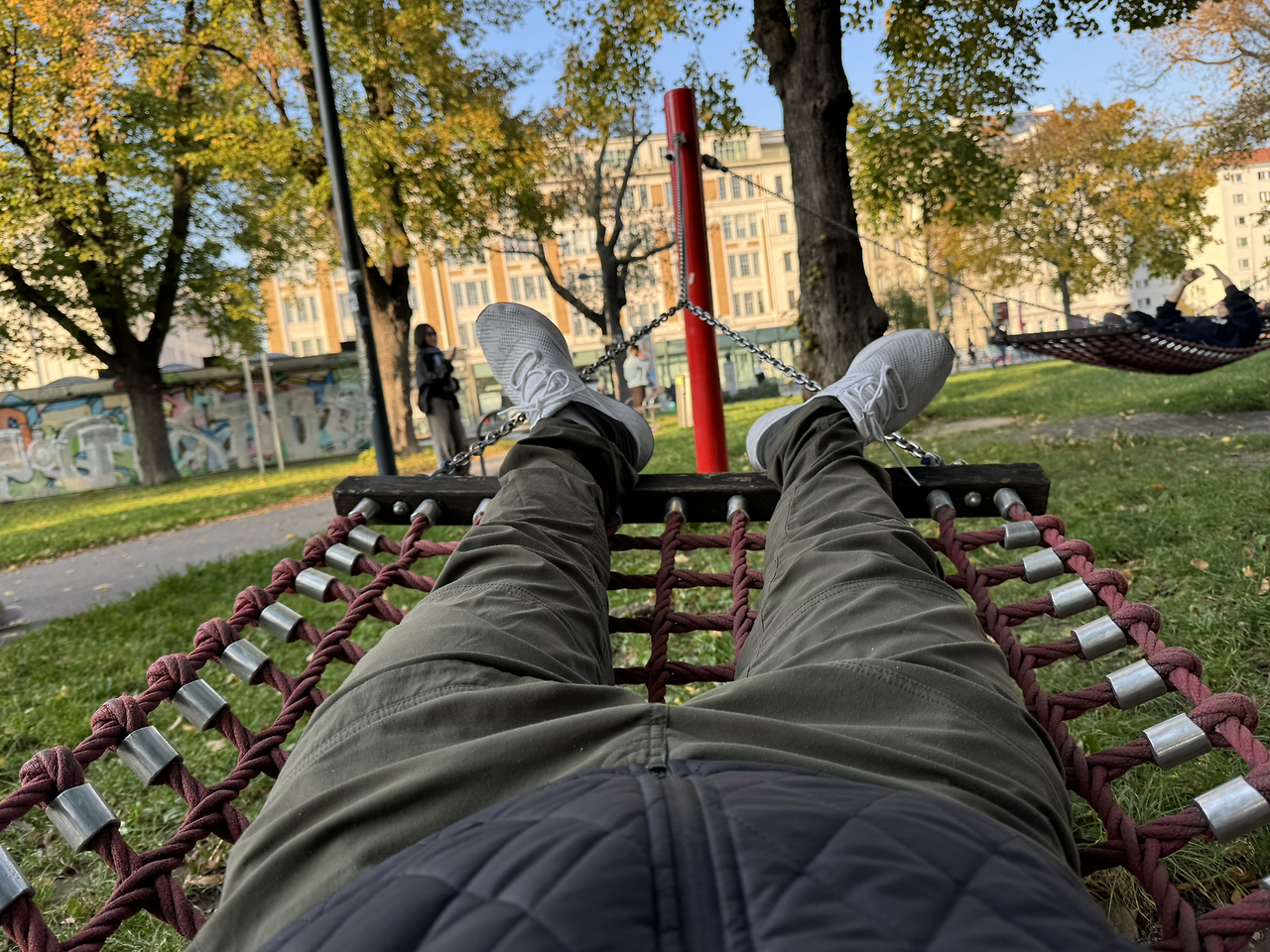 길 옆 자그마한 공원에 걸쳐놓은 해먹에 잠시 누워 흔들거리며 하늘을 본다.