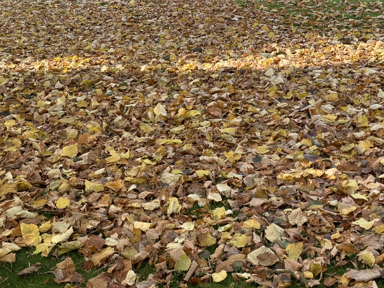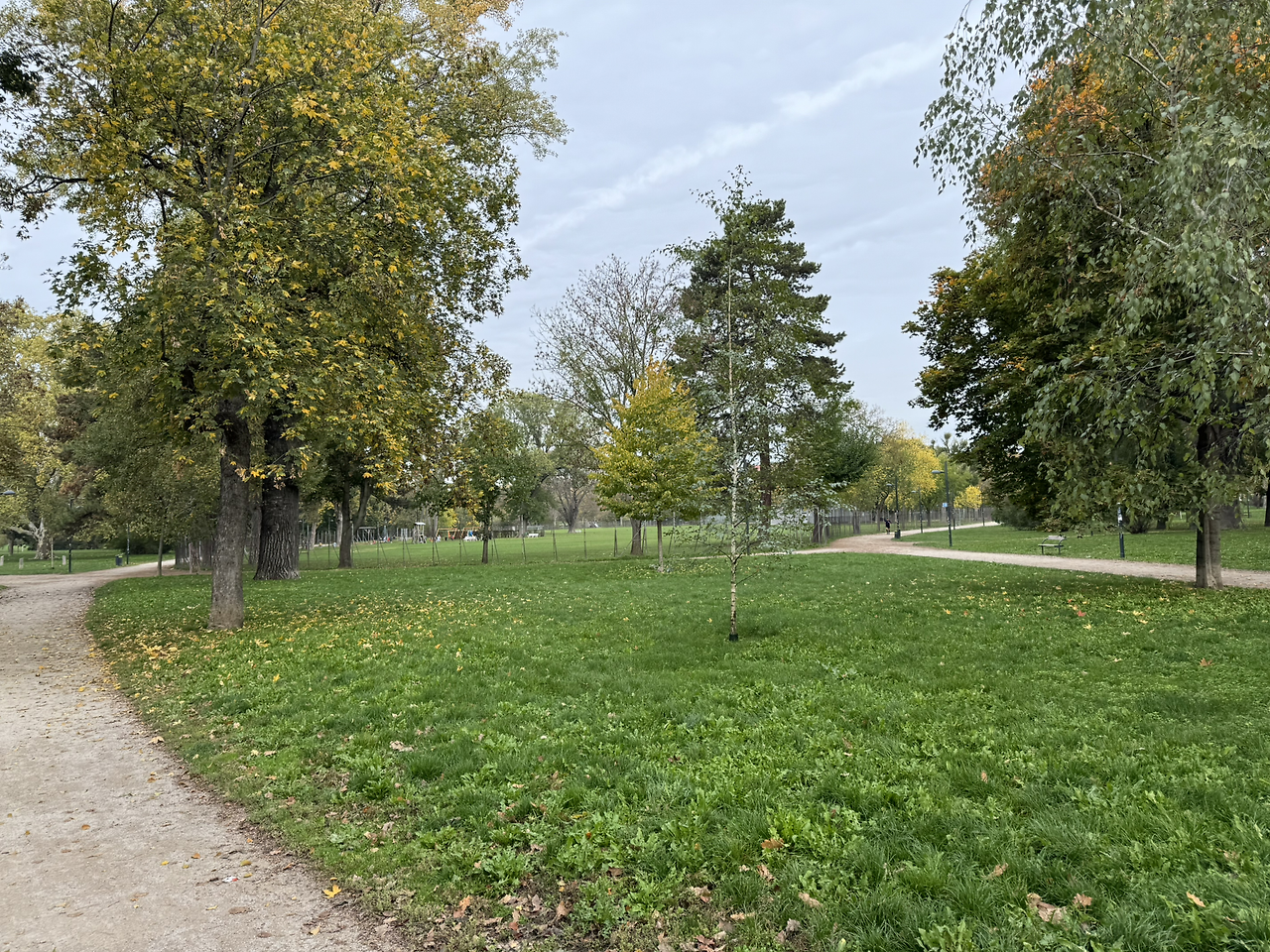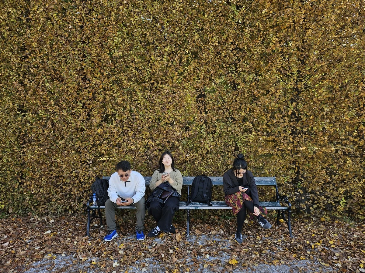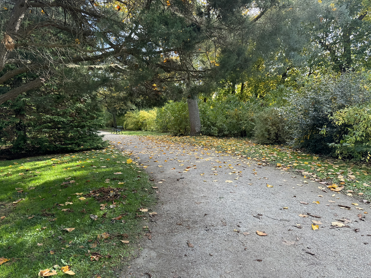 낙엽을 밟는 길인데, 앙상한 나뭇가지들만 있는 게 아니라 푸르고 무성한 나무들과 푸른 잔디밭에 떨어진 낙엽들을 보듬고 있는 듯해서 쓸쓸하지 않다. 2019년 겨울에는 넓기는 했으나, 약간 황량한 느낌이었는데, 지금 이곳은 바로 한 계절 전의 화려한 풍경들을 곳곳에 수놓아 눈이 호강한다. 새싹이 움트는 봄이나 화려한 꽃들로 장식된 여름은 얼마나 더 멋질지 상상해 본다.
