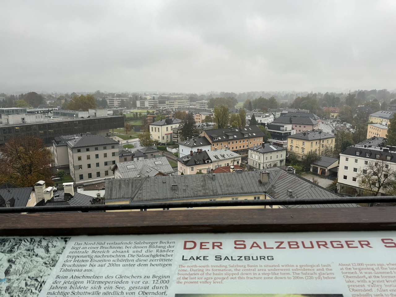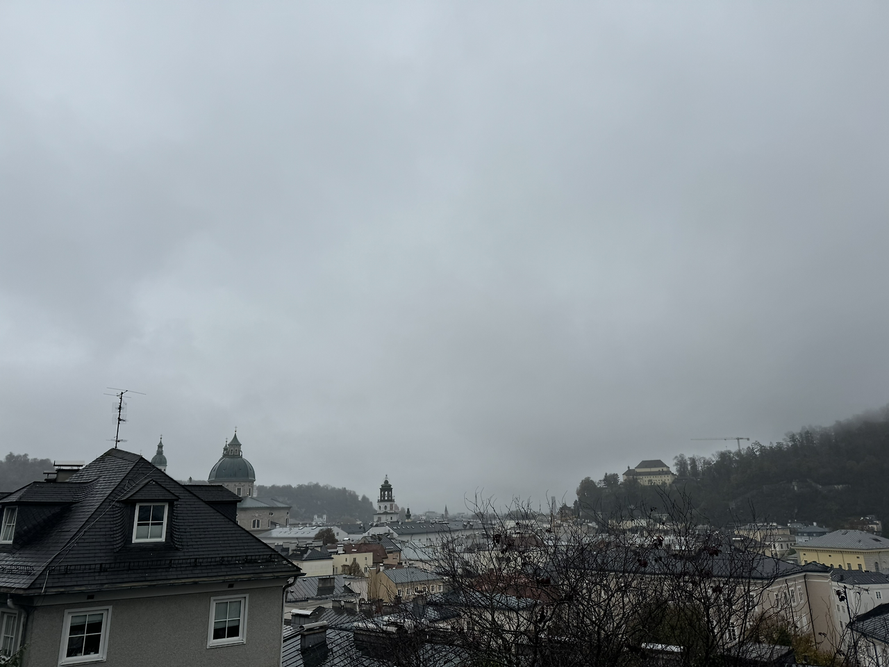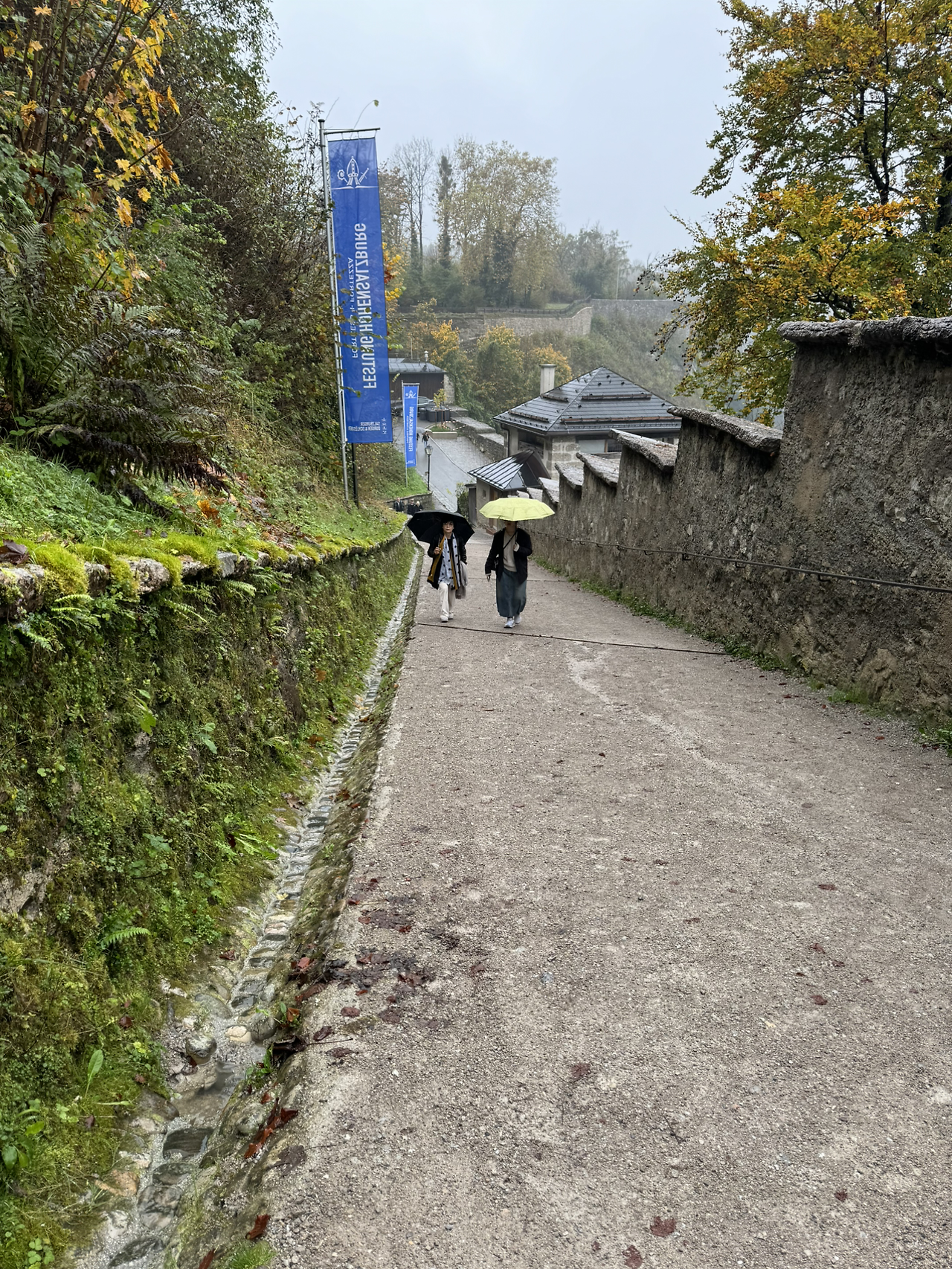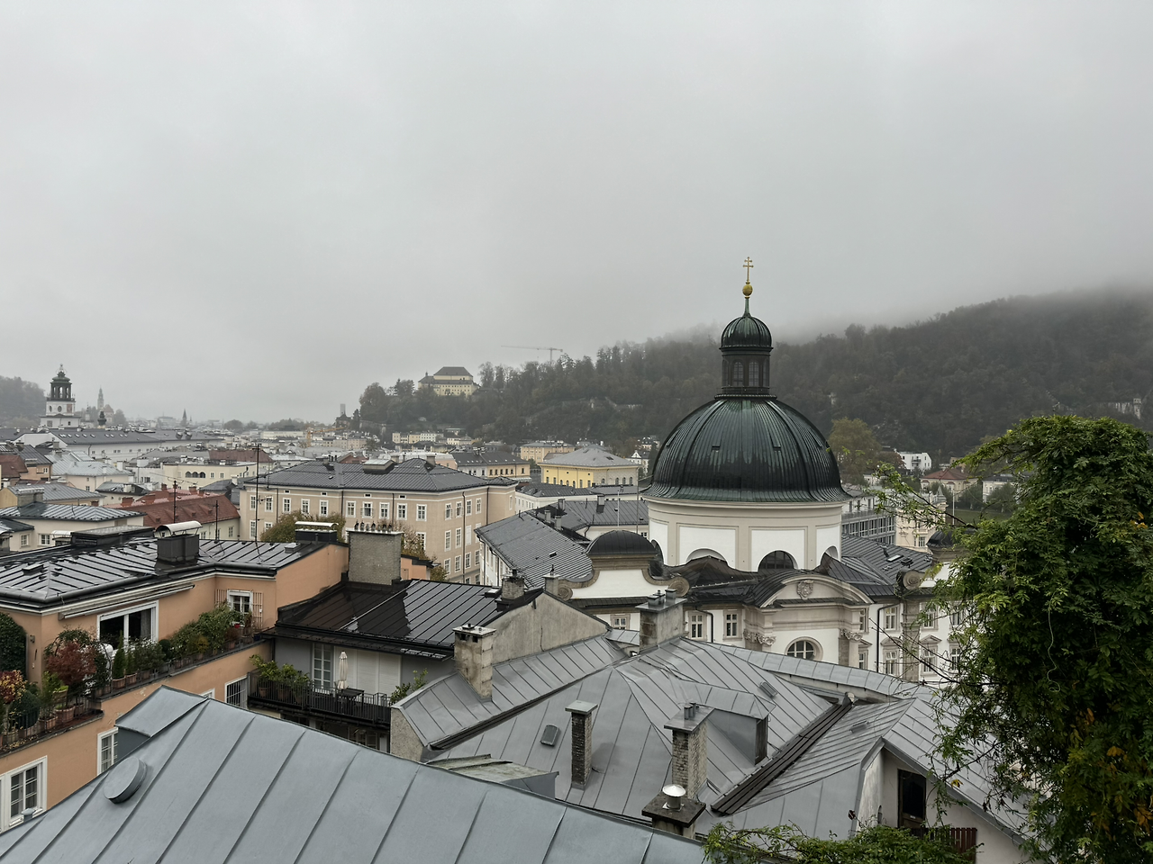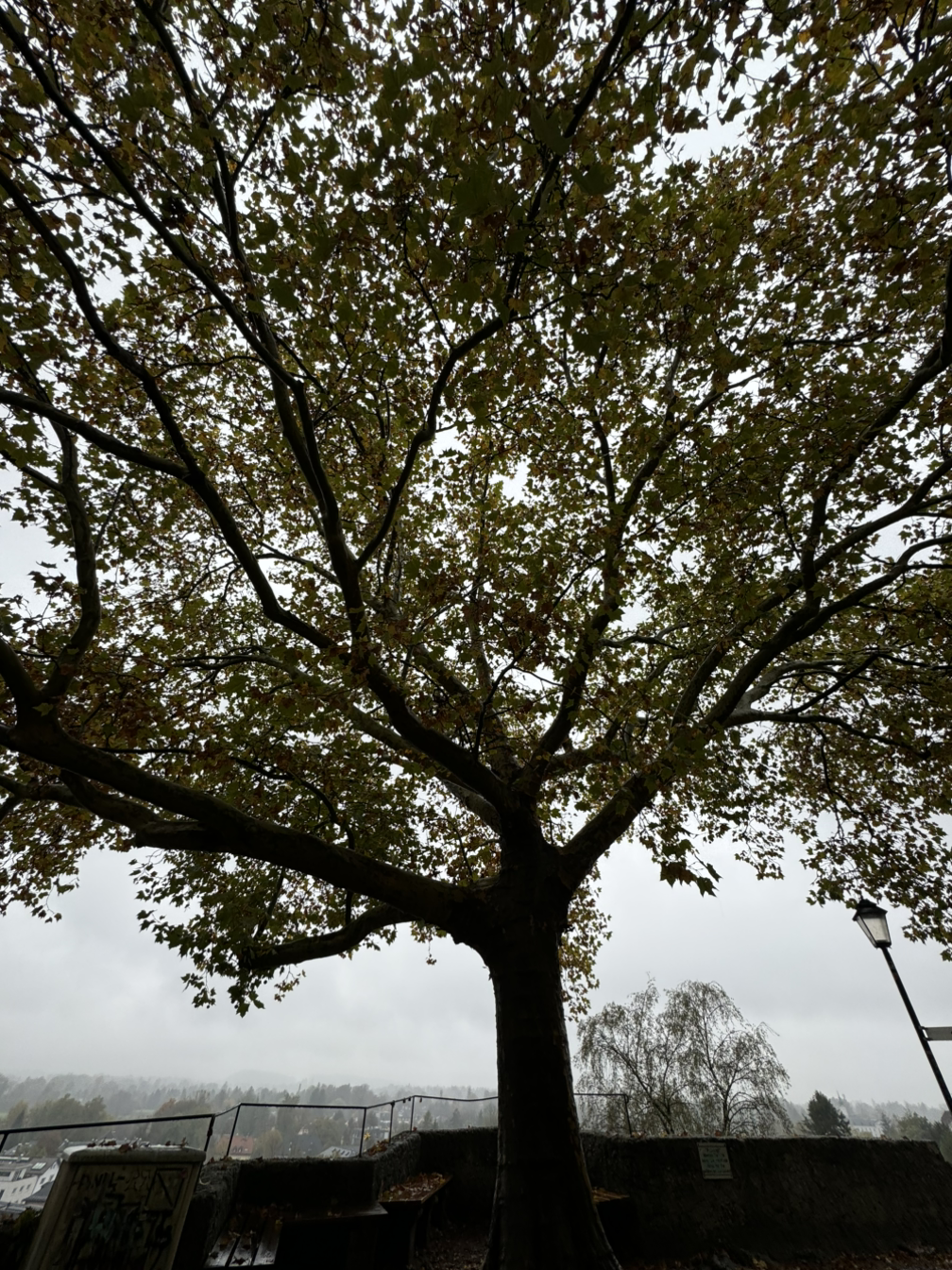 잘츠부르크 시내행 버스에서 으스스했던 몸을 녹이고 나른해질 즈음, 내려 잘츠부르크 성으로 향했다. 날씨가 흐리고 약하게 빗방울이 떨어지고 있었고, 원근감이 떨어져서 멀어 보이지 않았기에 잠깐 걸어가면 될 줄 알았다. 생각보다 경사가 가파른데 나만 생각하며 걷다 보니 식구들의 체력 소모를 배려하지 못했다. 잠시 쉬어가는 언덕에 큰 나무 한 그루가 마을과 성 사이의 경계지점에 있었다. 마을 어귀에 큰 나무가 한 두 그루 가 수호신 역할을 하는 것처럼 이 나무도 그런 역할을 하고 있었으리라.