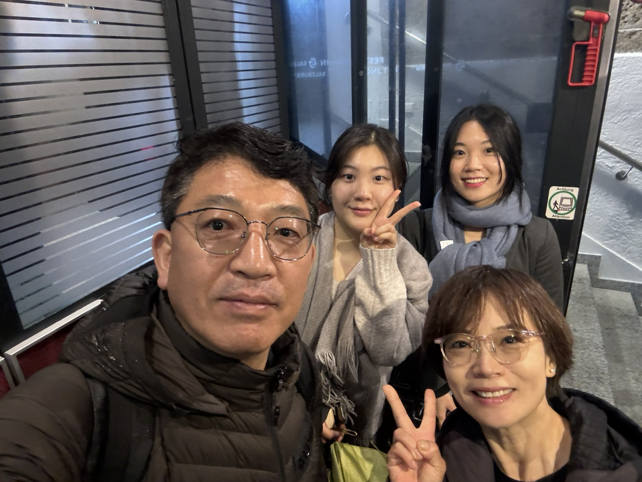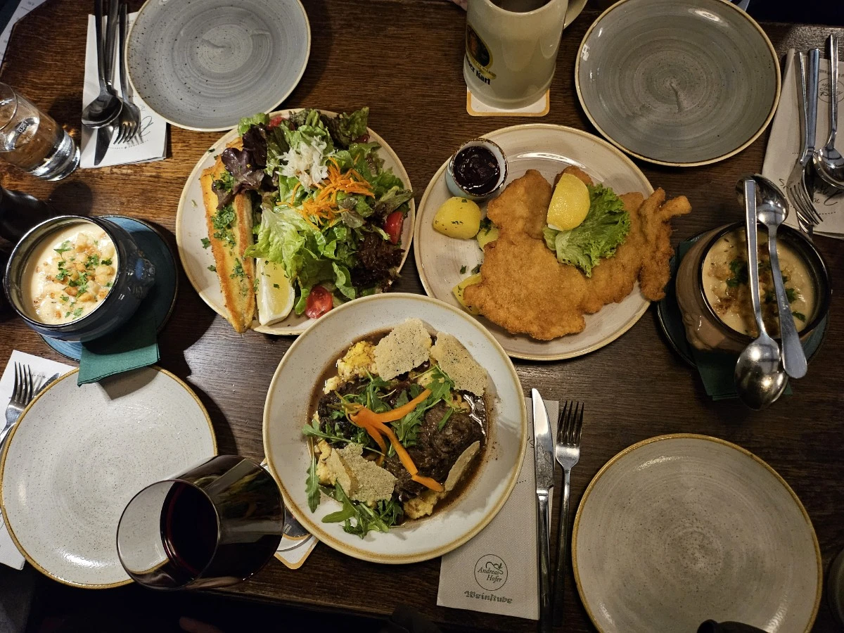 다들 힘들어하길래 눈치껏 살펴보는데 내려가는 전차 타는 입구를 발견했다. 잘츠부르크 24 카드로 탑승했다. 올라올 때 이걸 타고 왔으면 덜 눈치 보는 건데, 계획적이지 못한 나의 불찰을 조심스럽게 탓하며 편안하게 내려간다. 다들 표정이 밝아졌고, 광장에서 성을 배경으로 멋진 포즈를 취할 때 우울하고 힘들었던 기분은 모두 완전히 풀렸다. 뭔가를 먹기에 가장 좋은 환경이 만들어졌다. 부지런히 식사장소를 찾았다. 꽤 오래된 식당을 발견했다. 아니 검색했다. 그냥 발길 닿는 대로 가기에는 너무들 지쳤다.