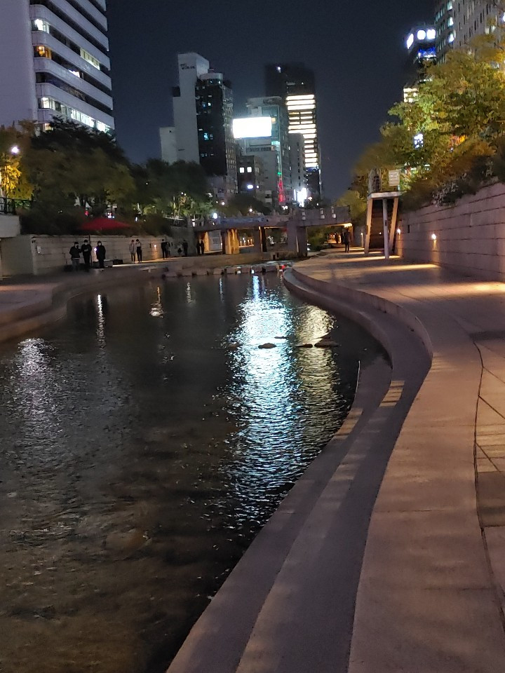 밤공기가 찬데도 제법 많은 사람들이 길을 걷고 있다. 모두 답답한 마스크를 쓰고 있고 나 역시 마스크를 쓰고 있는 것만 빼면 참 아름다운 모습이라고 생각했다. 몇 쌍의 연인들은 시간 가는 줄 모르고 계단에 걸터앉아 담소를 나눈다. 약간 취한 사람도 가끔 보이지만 많은 사람들은 산책 겸 운동 겸 나온 사람들이다. 코로나는 확실히 사람들의 통행량을 줄여놓았음을 느낄 수 있다. 1년에 한두 번은 청계천을 걷는데 그때에 비해 사람들은 많이 줄었다.