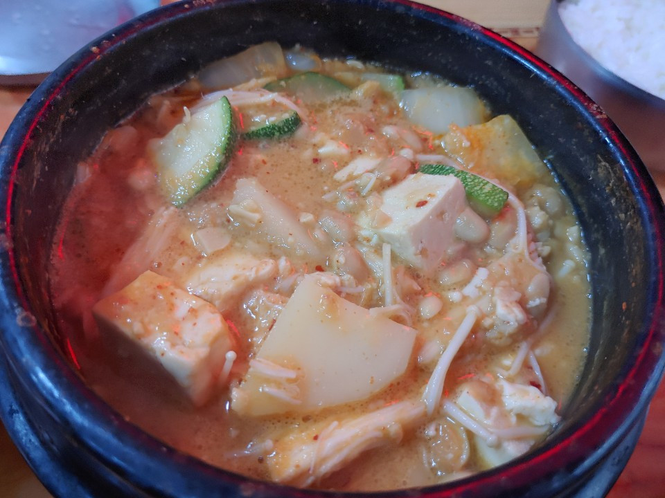 그런데 청국장 맛을 본 순간 한줄기 짜릿한 전율이 왔다. 진하고 깊은 청국장 맛의 바깥에서부터 안쪽으로 깊이 들어가는 느낌이다. 어떻게 숙성시켰는지 알 길은 막막하나 맛을 보면 그 깊이를 어느 정도는 가늠할 수 있다. 아주 제대로 숙성시킨 청국장을 만났다. 호박과 감자와 두부는 원래 청국장을 만나려고 거기서 기다리고 있었던 듯하다. 된장과 청국장은 각각 그 성장과정이 다르다. 된장은 발효시켜서 먹기까지 오래 걸리지만 청국장은 담근 지 2-3일이면 된다. 콩의 생생한 모양과 질감은 살아있되 으깨면 쉽게 무너지면서 자신의 몸을 통째로 입안에 바치는 그 순간이 청국장을 맛보는 지점이다. 밥과 청국장의 그치지 않는 교류 속에 어느덧 펄펄 끓던 순두부가 식어간다.