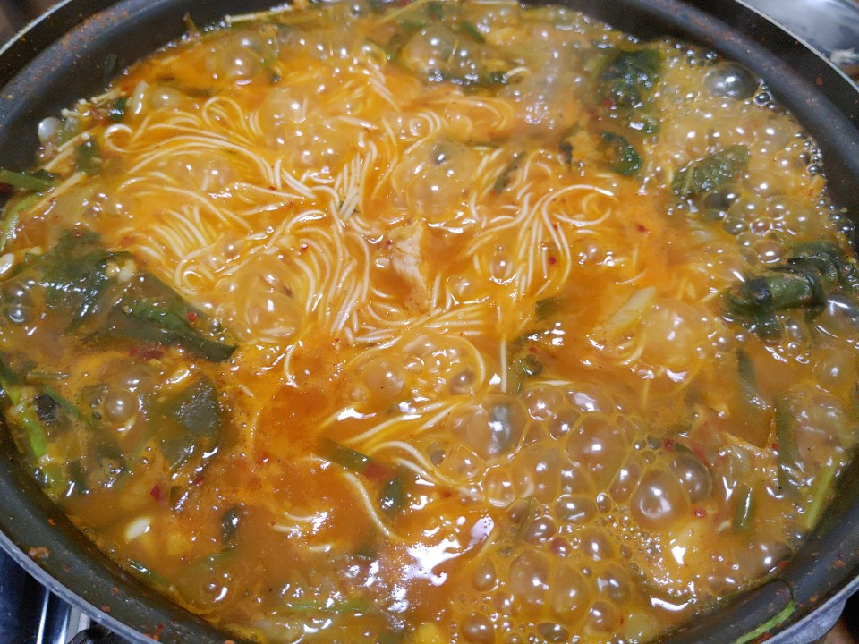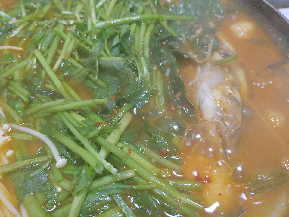 메기는 비교적 오래 끓여야 제 맛이 나는 것 같다. 빙어 튀김 두 접시를 순삭하고도 무우김치를 한 접시 다 먹을 때까지 나타나지 않는다. 어느 틈에 시장기가 가셔서 과연 저 메기 매운탕을 제대로 먹을 수 있을까 했는데 그건 순전히 기우였다. 깔끔하고 시원한 국물 맛이 일품이다. 미나리와 팽이 버섯을 건져 먹을 때도 그 국물맛이 진하게 배어 있다. 그런데 이 국물에 밥없이 그냥 먹기에는 허전하다. 그렇다고 사람 숫자대로 공기밥을 시키기에는 너무 양이 많을 것 같았다. 이 역시 기우였다. 곱게 지은 쌀밥과 국물이 완전히 일체가 되어 모두들 공기밥을 다 먹고 말았다. 메기를 한마리씩 건져 먹는다. 살은 부드럽고 감칠맛이 나며 뒷맛은 아주 깔끔했다. 고기와 채소를 건져내고 국수를 넣어 뒷마무리리를 하고 나니 땀이 쏟아진다. 계단오르기와 스피닝 자전거로 평상시 땀을 자주 흘리므로 음식을 먹으면서 땀을 흘릴 일이 별로 없었는데 오늘은 연신 흐르는 땀을 닦아낸다.
