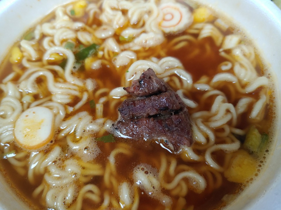 사발면을 괜히 준비했나 싶다가 갑자기 영화 <기생충>의 짜파구리가 생각났다. 육개장 사발면과 갈비는 잘 어울린다. 칼로리를 생각하면 조합을 생각할 수 조차 없다. 오늘처럼 우연히 서로의 만남을 확인한다. 육개장 사발면은 1982년 처음 출시되었다. '우리 입맛에 어울리는 얼큰한 육개장 맛'이라고 홈페이지에 소개되어 있으나 실제 육개장 맛과는 전혀 다르다. 전형적인 라면의 맛이다. 처음 이 육개장 사발면을 먹었을 때 어떻게 뜨거운 물만 넣어도 라면이 익는지 신기하게 생각했던 추억을 사무실에서 혼자 먹으면서 되새긴다. 사발면의 면발은 너무 일찍 개봉하면 딱딱하고 너무 늦게 개봉하면 퍼져서 먹기 거북하다. 그 쫄깃한 면발과 갈비의 부드러움을 입안에서 같이 경험한다.