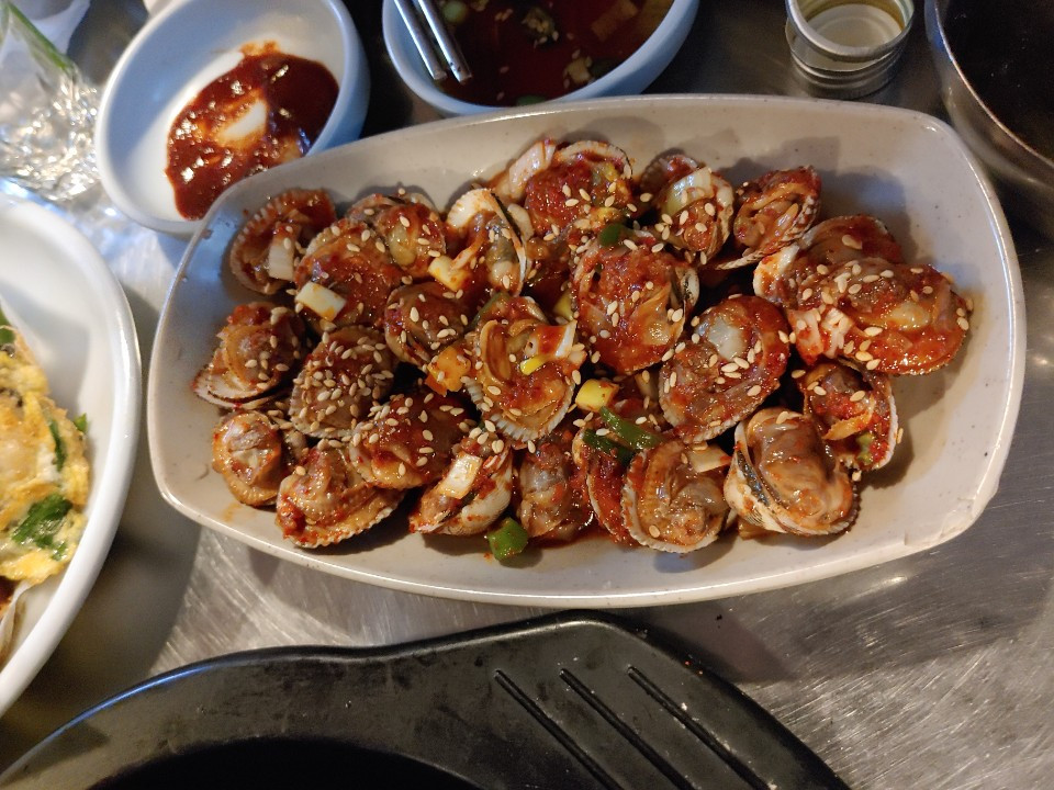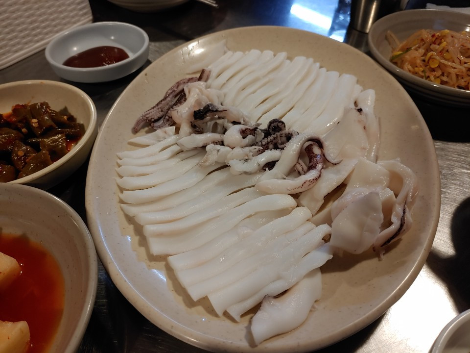 음식들을 즐겼던 시간은 지나갔고 아스라한 추억만이 남아있다. 지나간 모든 끼니는 다가올 한 끼니 앞에서 오직 추억만을 선사할 뿐이다. 된장국은 옅음에서 출발해 깊음으로 흐르고, 따뜻함에서 출발해 시원함으로 흘러가며, 배춧잎은 부드러운 속살을 입안 가득 선사한다. 그리고 막걸리 한잔을 들이켜고 부드러운 갑오징어 한 점의 맛을 음미한다. 쫀득한 질감을 누르고 부드럽고 약간은 가벼운 맛을 느낄 수 있다. 군산에서 먹은 갑오징어는 쫀득하고 입안을 휘감는 질감과 함께 진한 먹물로 자극했던 반면에 이 갑오징어는 은은하고 가벼워서 손이 가게 된다.