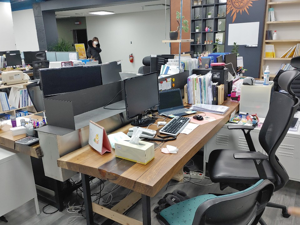 영하 10도가 넘는 추위. 사무실 안은 따뜻하고 아늑했다. 3년 전에 새롭게 단장한 디자인이 그런 분위기를 만들어 준 것으로 보인다. 사무실 디자인이 너무 마음에 들어 물어보니 인테리어 대표가 매일 직원들이 퇴근한 저녁에 음악 틀어놓고 차 한잔 마시면서 한 땀 한 땀 칠했다고 한다. 요즘도 이런 사람이 있나 싶었다. 전체 공사 가격과는 전혀 맞지 않는 세심한 디자인과 칠에 감탄을 거듭했다. 그리고 군데군데 일상의 일터에서 일하는 사람들을 위로해줄 약간은 여유 있는 웃음 요소들이 있어서 한번 더 감탄했다.