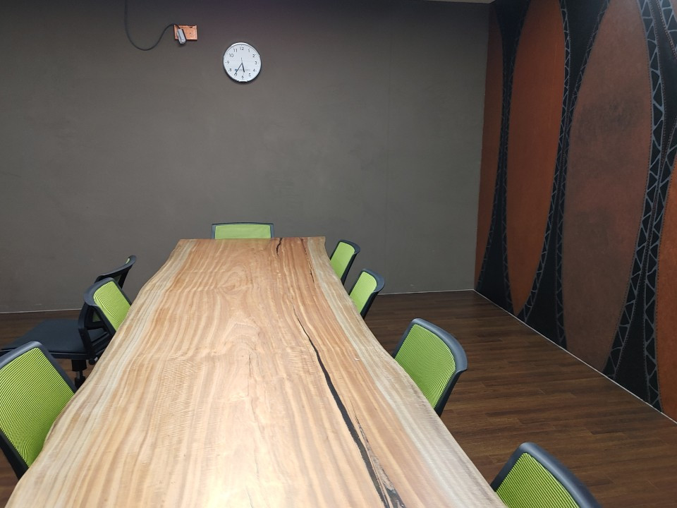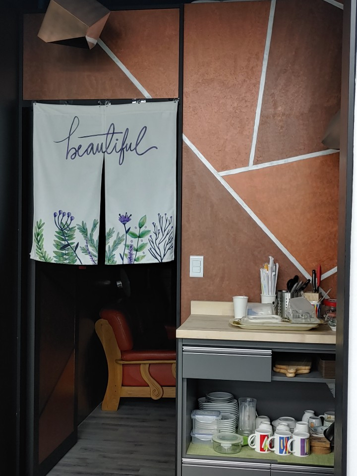 규격화되지 않은 책상들도 멋져 보인다. 퇴근한 직원 선생님들 허락을 받지 않고 사진을 찍는 무례함을 용서해달라고 마음속으로 빌었다. 사무실 군데군데 색칠들은 계획요소를 벗어나 자유로웠지만 정성이 담겨있지 않다면 어색해 보일 수 있는 그림들이 전체적인 주요 색감과 절묘하게 조화를 이루고 있었다. 차를 마실 수 있는 탕비실은 식당의 주방으로 들어가는 그림을 연상시켰다. 천정과 바닥도 아늑함을 더해주고 회의실의 디자인도 역시 자유롭게 구성되어 있었다. 예산을 많이 들였으나 뭔가 어색해 보이거나 딱딱하고 경직된 곳은 많이 가봤지만 이렇게 예산을 별로 들이지 않고 어떤 사람의 정성으로 만든 곳이라고 생각하니 부러웠다. 그 정성과 가치가.