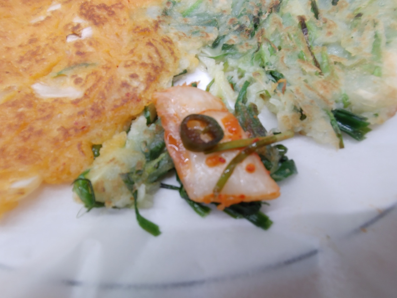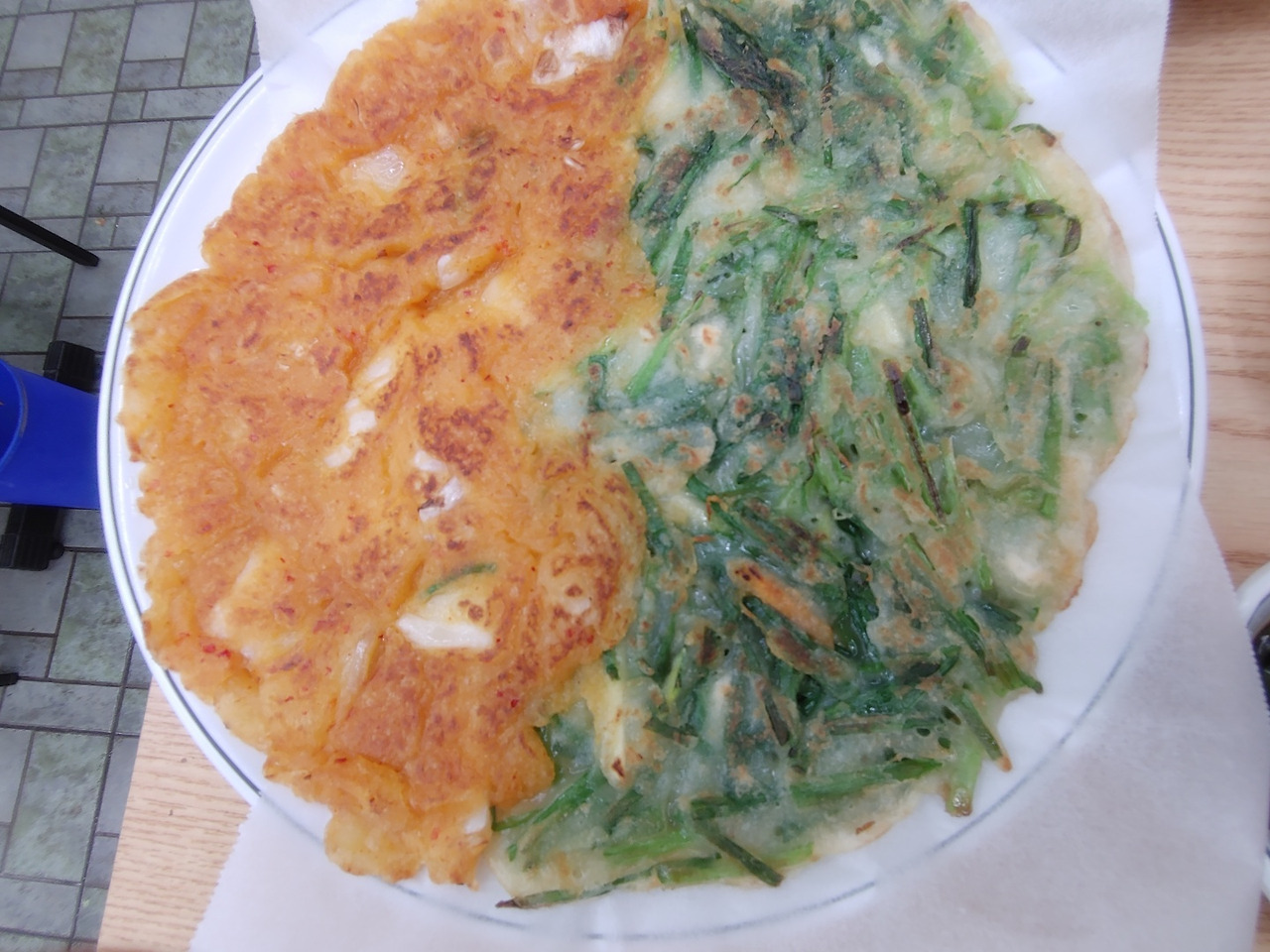 부추전과 김치전을 반반 섞어 놓은 전을 주문했다.