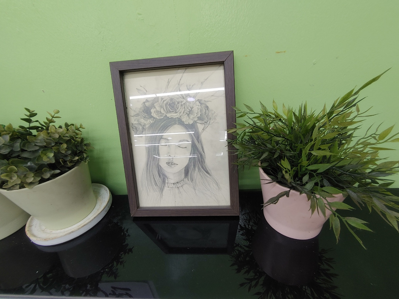 액자에는 꽃을 머리에 장식한 여인의 모습을 볼 수 있다.