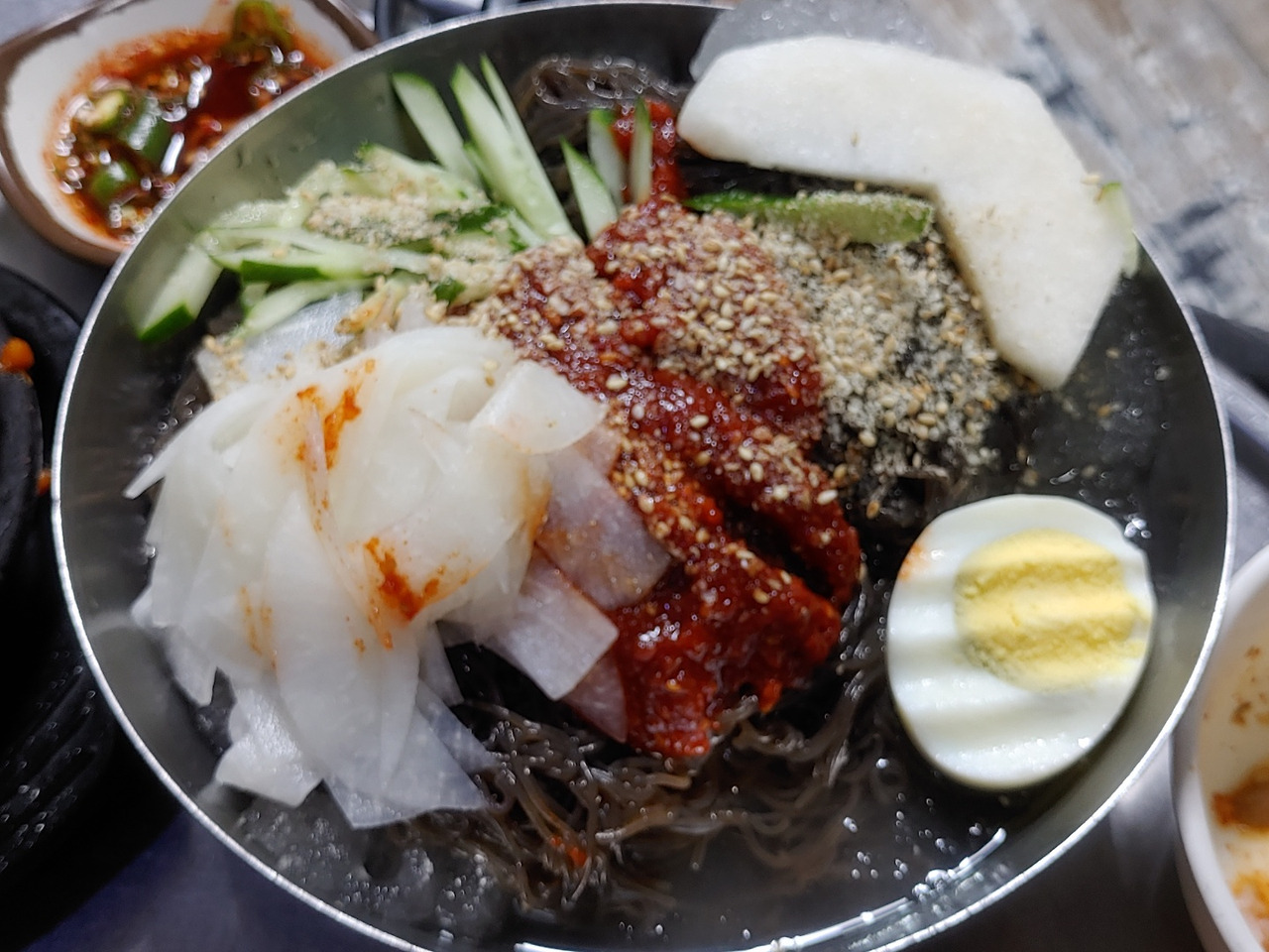 2011년 동교동에 살던 때 <땡땡이 소금구이>라는 가게를 자주 찾았다. 소금구이 고기도 맛있었지만 특히 고기를 찍어먹던 소스는 신문 맛 칼럼에 등장할 정도로 맛있었다. 기차가 다니지 않던 기찻길을 오가던 재미도 있었다. 그 가게는 우리가 이사 온 뒤로 후배들과 그 거리를 찾았는데 사라졌다. 소스에 대한 기억만이 남아있다가 오늘 이 가게의 소스를 접하면서 그 시절 소스의 기억을 떠올리게 한다. 뒷통 살의 질감과 식감을 그대로 살리면서 입안 가득히 퍼지는 소스의 위력에 감탄한다. 숙성된 샐러리 초무침과 구운 마늘, 상추 파무침에 냉면을 곁들여 상추 한쌈을 먹으니 더 바랄 것이 없다.