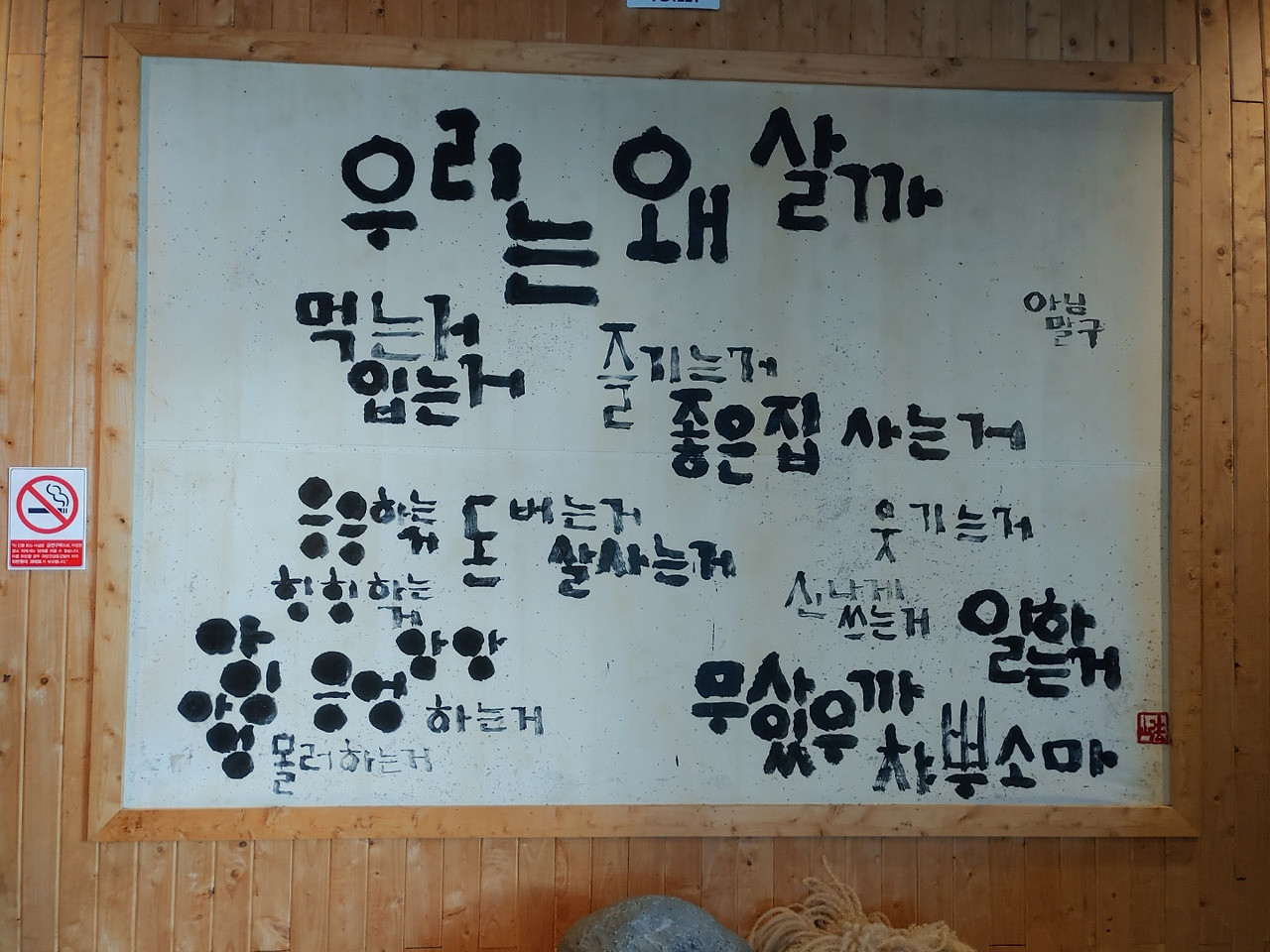 서서히 배가 고프다. 보말 국수 가게는 코로나가 무색할 만큼 사람들이 많다. 방역수칙은 제주 어디에서나 철저하게 지켜지고 있었고 여기도 마찬가지다. 손을 씻으러 화장실에 갔다가 나오는데 내 눈을 사로잡은 복판에 의미심장한 문구들이 눈에 들어왔다. 우리는 왜 살까? 먹는 거, 즐기는 거, 좋은 집 사는 거.... 잠시 깊이 생각하려다가 벽판의 이미지대로 그냥 흘려보냈다. 어떤 메시지를 머리에 담고 이리저리 굴려보던 때가 서서히 지나가고 있다. 가슴에 잠시 담아두었다가 덜어낸다. 그렇게 내 가슴을 담금질하면서 나는 말로 닿을 수 없는 인생의 깊이에 조금씩 조금씩 다가가고 있다고 착각한다.