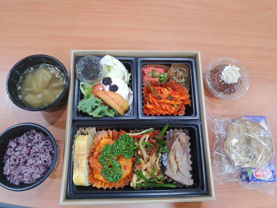 확진자가 늘어나면서 도시락 수요도 같이 늘 수밖에 없는 현실에서 한 끼 때우는 개념이 아니라, 도시락 하나로 바다와 육지를 넘나들며 완벽한 여행을 할 수 있음을 맛으로 느끼게 해 주었다. 종이상자는 도시락을 들고 와서 먹고 버리는 환경에 대한 내 마음의 부담을 훨씬 덜어주었다. 코로나가 장기화된다면 모든 국민이 지속적으로 사용 가능한 도시락 용기를 각자 갖추고 식재료 공급업체는 그 도시락 용기에 음식을 전달하는 역할을 수행하는 것으로 조금 더 번거롭기만 하다면 좋겠다는 혼자만의 상상을 해보았다. 아마도 그렇게 하기는 쉽지 않을 것을 알기에 그리고 환경에 대한 부채의식이 여전히 뒷덜미를 긁고 있음을 알기에. 아쉬운 점은 이런 멋진 도시락을 먹으려면 20명분 이상 주문해야 된다고 하니 자주 접하지는 못할 것 같다.