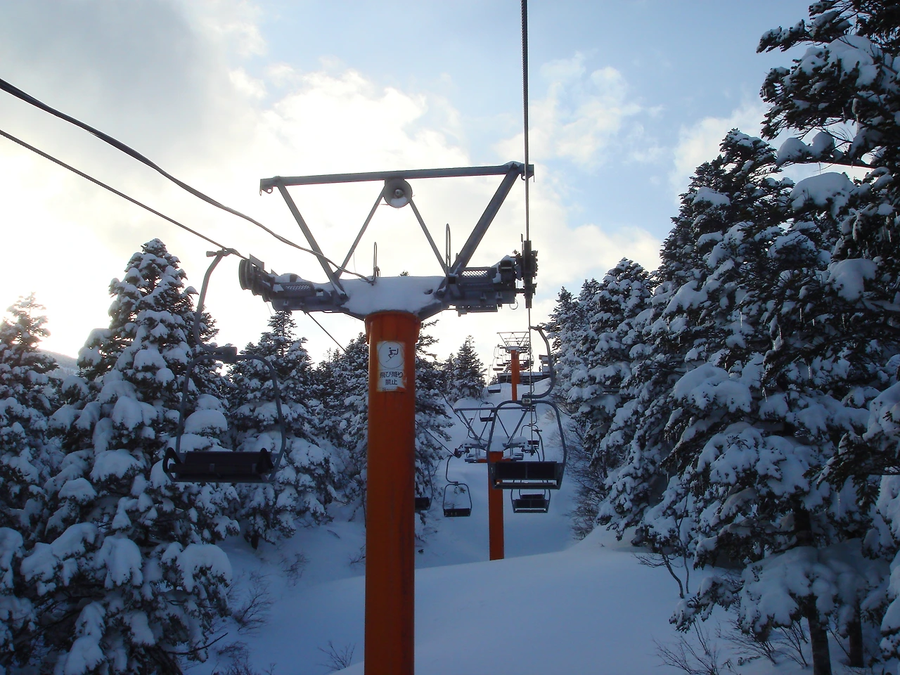 정상은 아래와 또 달리 경치가 정말 좋다. 멀리 산들이 한꺼번에 보이고 눈도 더 깊다. 사진을 찍고 내려가려니 정말 경사가 장난이 아니다. 다리가 후들거리기 시작하다. 두 번 정도의 경사를 내려오고 나니 조금씩 자신감이 붙는다. 그리고 경사가 급한 곳인데 평지가 보이는 곳, 중간에서 활강을 했다. 시원하다. 모자 벗어버리기 잘한 거 같다. 일행들이 보이지 않아 다시 중간지점으로 올라가는 리프트를 타다. 그 활강코스! 계속해서 활강코스를 5회 정도 타는데 아래에서 설상차가 올라가다. 그래 우리 일행 중 초보 자들이 사고가 난 건 아닌지 걱정이 앞선다.