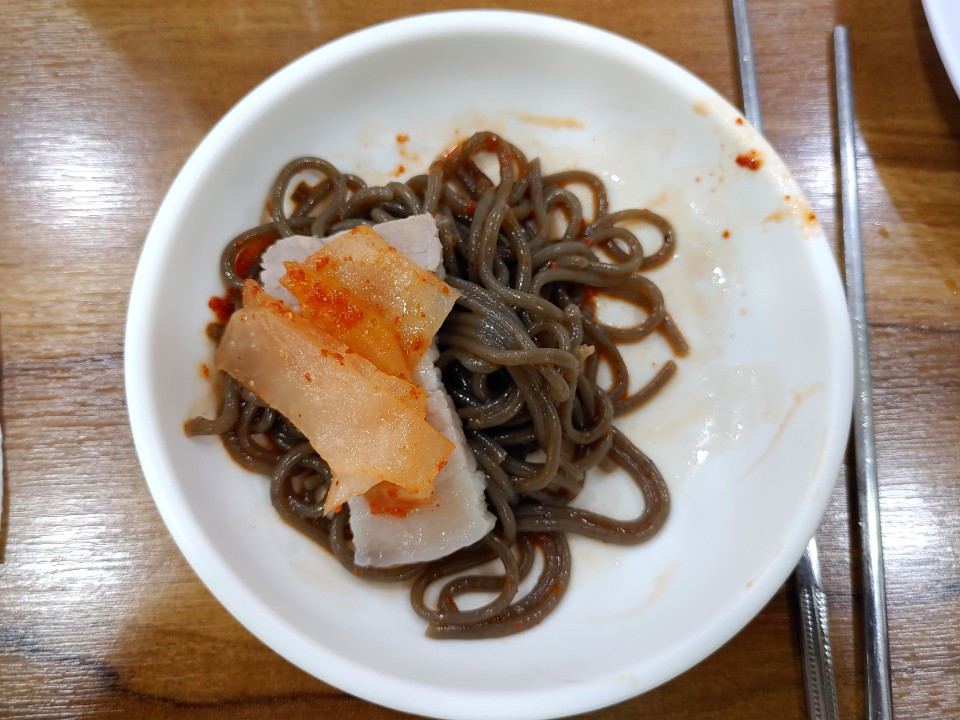 같이 동석한 사람들의 취향에 따라 물과 비빔 중 한쪽은 사이드 메뉴가 된다. 오늘의 사이드 메뉴는 비빔막국수다. 비빔막국수 한 젓가락에 역시 무와 제육을 올려 한 입에 넣는다. 메밀 맛과 비빔 양념의 고소한 맛, 무 무침의 다양한 맛, 부드러운 제육이 어우러지면서 완벽한 하모니를 입안에서 연출한다. 이 가게가 만들어온 맛의 기둥은 단단하게 느껴진다. 음식 만드신 설계자의 의도가 어떤 것인지는 알 수 없지만, 내 나름대로 맛을 만들어먹고 있다.