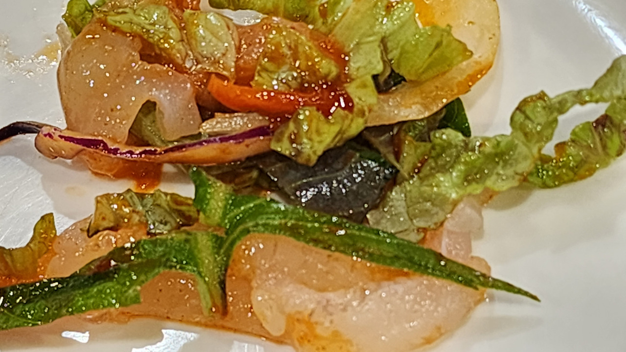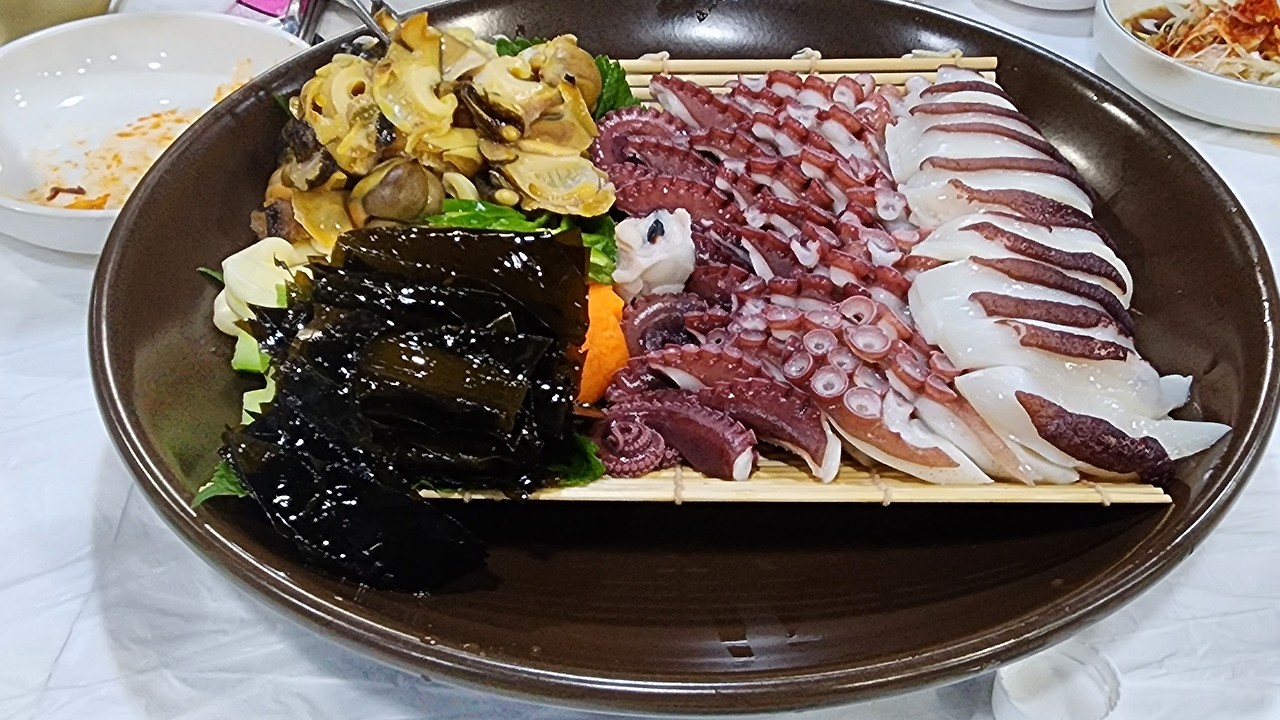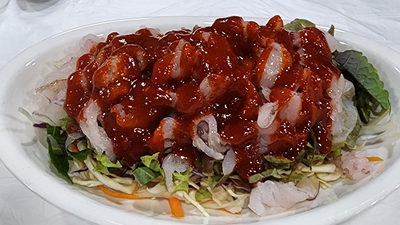 메인 요리를 만나기 전 잠시 "잠시 검문 있겠습니다"라는 자세로 가자미회와 채소를 매콤한 양념에 버무린 먹음직스러운 음식이 먼저 등장했다. 가시와 뼈가 촘촘히 박힌 가자미를 처음 접했을 때는 전혀 매력적인 생선이 아니었다. 가끔 밥상에 올라왔을 때 젓가락으로 열심히 가시를 발려내고 먹다가 그 가시가 살과 섞여 입안에서 정리정돈 되지 않은 당혹스러운 상황을 몇 번 맞았기 때문이다. 나이가 들며, 음식에 대한 수용력이 점점 확대된다. 가자미찜과 가자미 구이를 먹기 시작하자 뼈와 가시에 붙어있는 살들을 잘 끄집어내는 기술이 빠른 속도로 진화했다. 가자미 물회는 으뜸인 음식이다. 가자미는 어느덧 없어서 못 먹는 매력적인 생선으로 변했다.