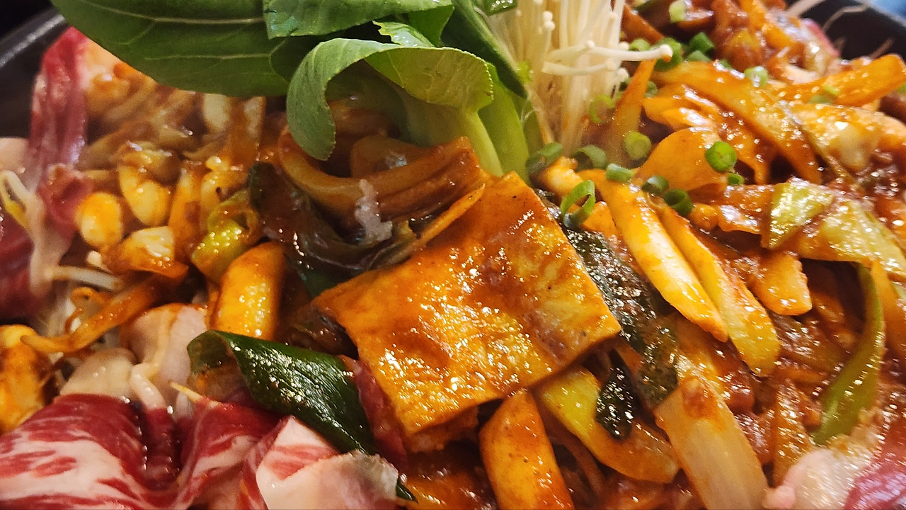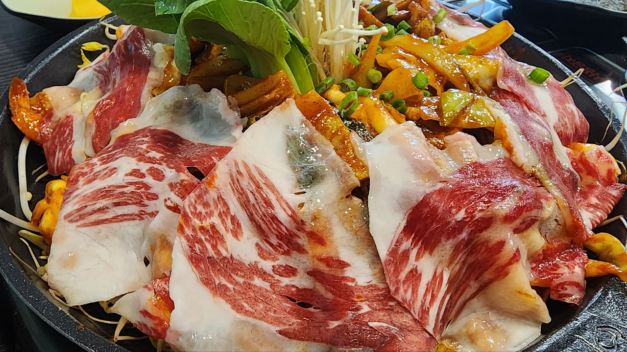 갑오징어는 오징어 자체가 가진 두툼한 부드러움과 씹을 때의 촉감 그리고 그 씹는 스케일에서 오는 만족감과 옅은 바다내음을 맛볼 수 있는 음식이어서 굳이 다른 양념이나 재료들 없이 재료만 나오고 소스가 나오는 게 보통인데, 철판볶음 형태로 나오니 일단 그동안 먹었던 모양과 다르니 좋다. 같은 것을 맛본다는 것은 안정적 기대감을 충족시키는 일이다. 다른 것을 맛본다는 것은 새로운 맛세상과 만나는 일이니 설렘이 동반된다. 갑오징어와 양파를 비롯한 채소 등을 살짝 데친 뒤에 거기에 팽이버섯과 청경채와 차돌박이를 적절히 장식해서 나온 모양이 너무 예쁘다. 깻잎에 김을 올리고 거기에 갑오징어와 채소 그리고 차돌박이를 얹어 한 입 싸 먹는다. 갑오징어의 두툼한 식감을 중심으로 고기와 채소들이 거들면서 새로운 맛의 세계로 빠져든다.