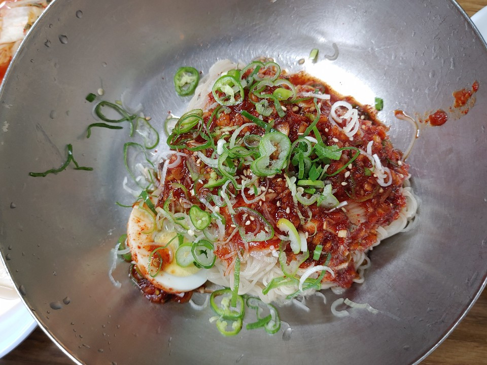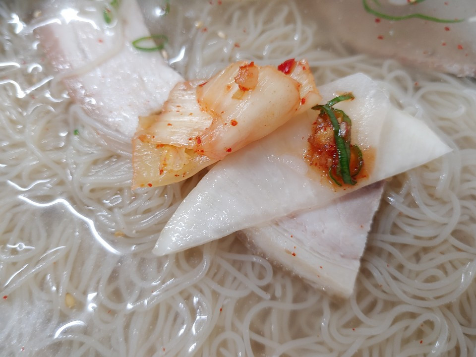 사이드 메뉴로 주문한 비빔냉면은 그 깊이를 알 수가 없어서 한 젓가락 먹고는 다시 물냉면에 집중한다. 국수 한 젓가락, 국물 한 모금 넘길 때마다 매번 말로 표현할 수 없는 감동이 밀려온다. 국수면발에 편육과 배추김치와 무김치, 그리고 소스를 살짝 얹어 먹는다. 이렇게 맛을 낼 수 있는 융합은 아주 쉬운 융합이다. 세상에 융합기술과 융합학과 융합공정이 어려운 이유는 이렇게 쉽게 맛을 내지 못하기 때문이 아닐까라는 엉뚱한 상상을 해본다. 편육은 돼지고기 내가 거의 없고 깔끔하고 담백하게 국수와 어울린다.