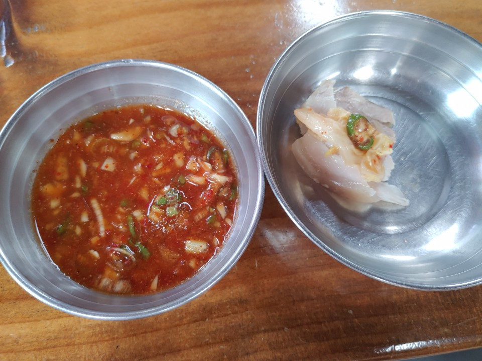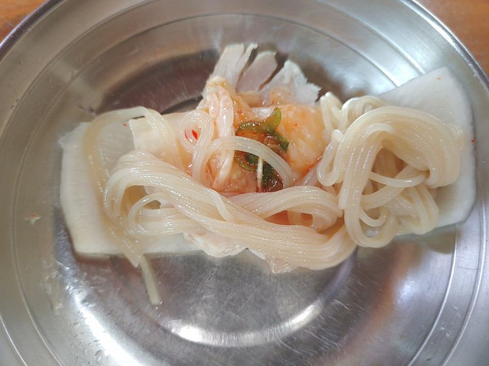 편육은 우선 접시 밑에 깔고 그 위에 무김치와 배추김치를 하나씩 올려놓는다. 새우젓의 새우 두 마리를 얹고 그 위에 마늘 한 조각과 된장을 올려놓으면 먹을 준비가 완료된다. 그리고 젓가락으로 한 번에 입에 넣는 것이 포인트. 새우젓은 돼지고기 소화에 탁월하다. 배추김치의 연한 맛과 무김치의 시원한 맛이 편육에 버무려지는 순간을 즐긴다. 이 역시 시장기를 잠시 잠재우되 많이 먹지 않는다. 메인은 오직 냉면이기 때문이다. 사이드 메뉴는 사이드 메뉴로서의 역할에 족하다고 생각한다.