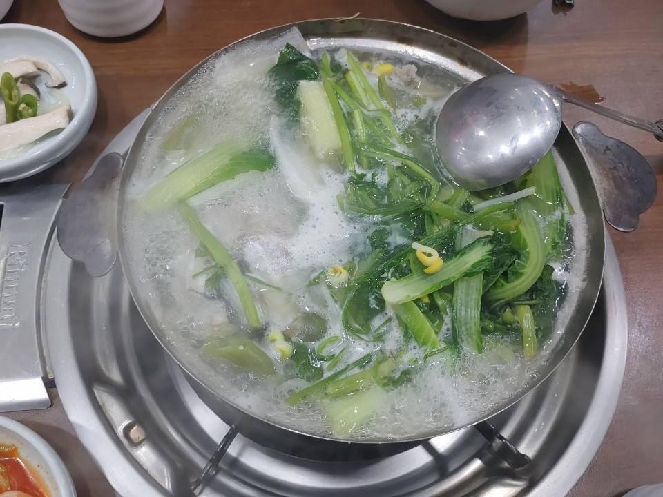 한참 달궈진 불판 위에 먼저 양념으로 버무린 복어와 팽이버섯이 안착하고 뒤를 이어 미나리와 파, 쑥갓이 그 위에서 숨을 덮어버린다. 처음에는 잘 몰라, 복어가 다 타서 맛이 없지 않을까 하는 염려마저 들었었다. 그렇게 한 숨을 덜어낸 뒤 장 젓가락으로 휘휘 저으면 뻣뻣하던 채소들이 부드럽게 복어와 섞여 먹기 좋은 상태가 된다. 먼저, 미나리와 파를 먹고 뒤이어 복어를 팽이버섯과 같이 먹는다. 채소를 더 먹기 원하는 경우 더 리필해주신다. r가열된 불판위에서 복어는 약간씩 말라가니 촉촉한 맛을 쭈욱 유지하기 위해서는 바로 먹는 게 좋다.