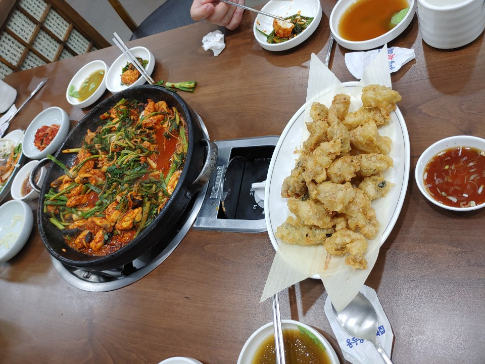 복불고기를 어느 정도 먹을 무렵 복튀김이 나온다. 겉은 바삭하고 속은 촉촉한데, 촉촉한 느낌이 즙이 많은 상태가 아니어서 식감이 좋다. 젓가락은 어느새 복불고기와 튀김 사이를 왔다 갔다 한다. 밑반찬으로 나오는 채 썰어 볶은 감자는 아주 무르지 않고 약간은 아삭아삭한 맛이 있어 복불고기와 잘 어울린다.
