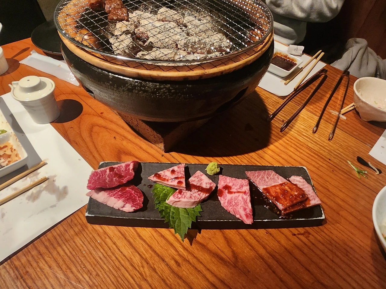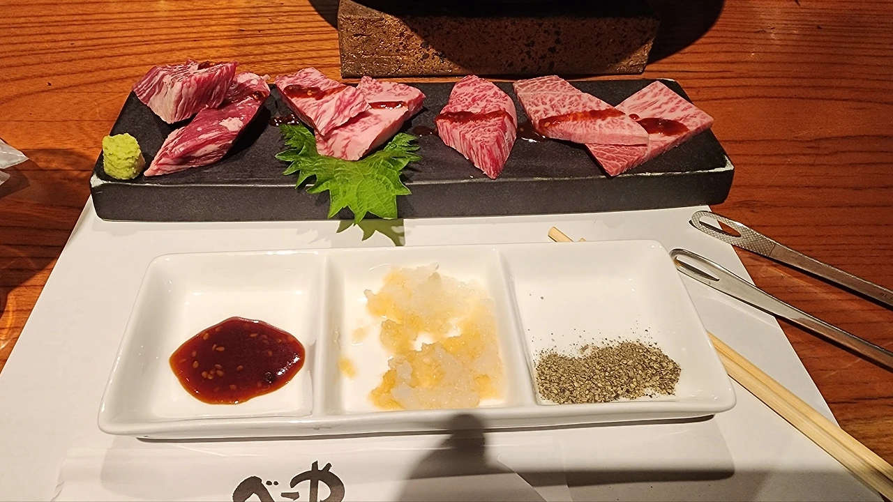 이제 메인 코스를 향해 출발한다. 1인당 소고기 8점의 접시가 등장했다. 고기의 양과 가격을 생각하면 참 일본 답구나! 고기의 맛은 나무랄 데가 없었다. 적쇠도 갈아달라고 하면 잘 갈아줘서…. 그동안 같이 일본여행 와서 먹었던 고깃집들이 스쳐 지나간다. 홋카이도에서 먹었던 양고기 구이(아 이 집은 불판을 절대 바꿔주지 않는다. 자욱한 연기가 꽉 찬 방이었지만 맛있게 먹었던 기억), 벳푸의 와규집이 고기의 질은 가장 좋았던 것 같다(카드가 안된다고 해서 할 수 없이 후배님의 현금을 빌려 계산하고 나중에 돌려주는 해프닝이 있었다. 일본은 여전히 현찰을 좋아하고 현찰을 고집한다. 금융시스템에 대한 불신일까 아니면 카드 수수료가 높아서일까 내 생각에는 현금을 보유하려는 기질이나 특성이 있으리라고 본다)