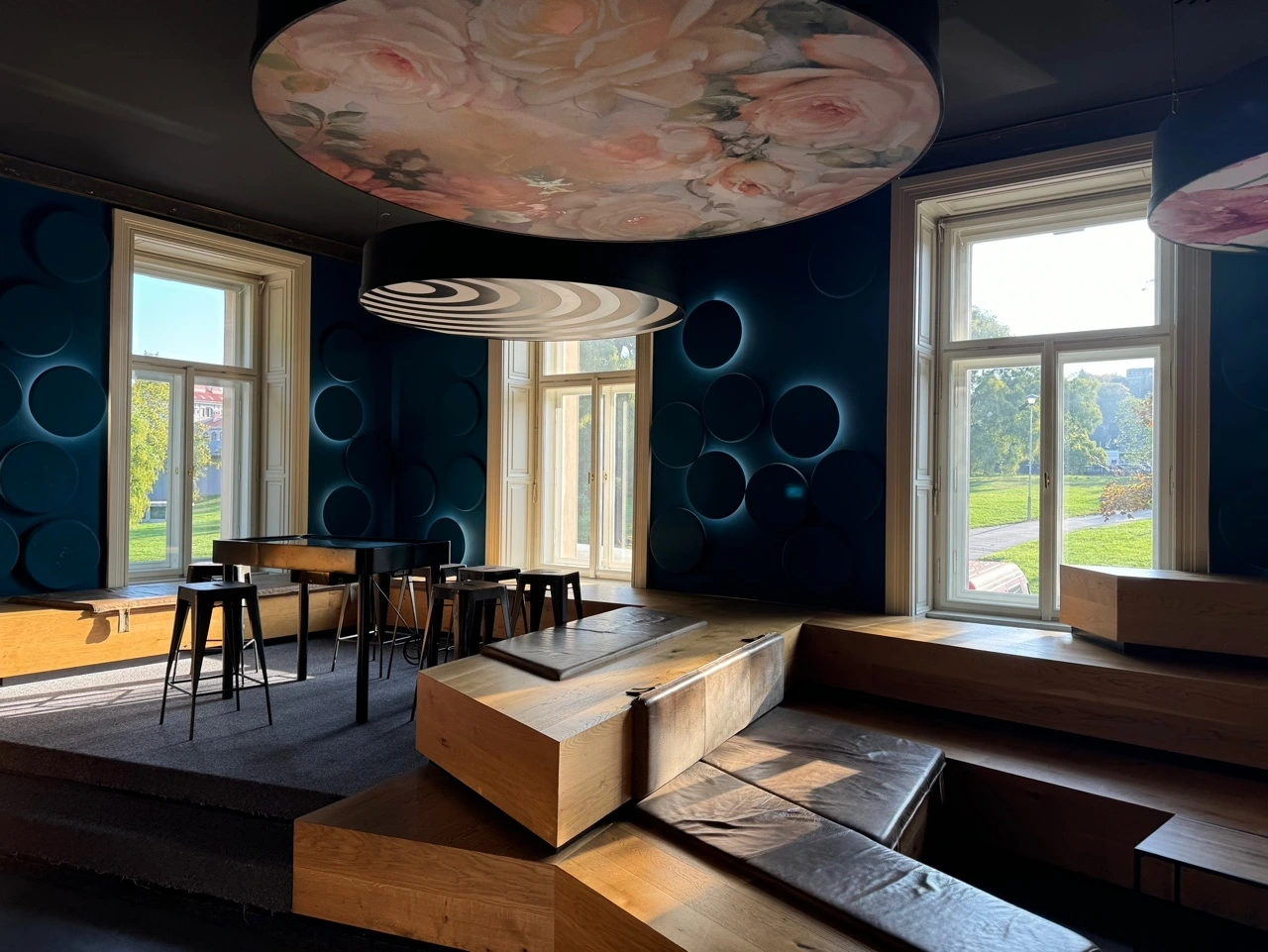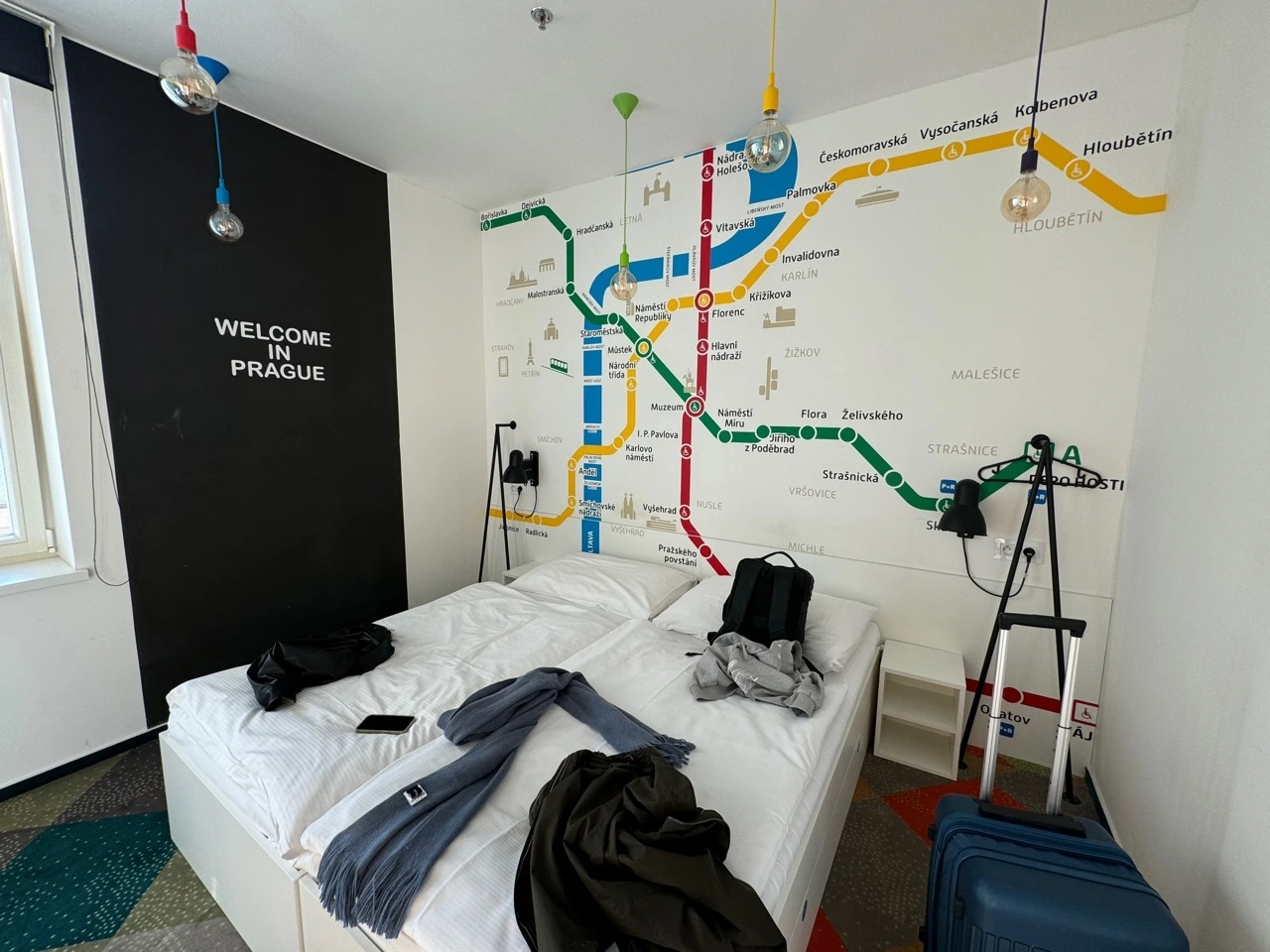 호텔방 키는 나무조각에 큐알코드를 새겨 넣었다. 키는 제대로 작동되었다. 호텔방 역시 독특한 감성이 묻어 있었는데, 벽에 Welcome in Praha 문구가 선명하다. 한 벽면 전체가 전철 아니면 트램 노선도였다. 천장에, 빨간 등 파란 등 노란 등 초록색 등 보라색 등등 다양한 색깔의 전등이 내려 비치고 있어서 아주 독특한 느낌을 받았다. 평소 원색을 눈여겨보고 옷을 고를 때에도 원색을 선호하는 내 기호에 딱 들어맞는 곳이다. 비엔나에서는 세 사람이 같이 묵을 때 짐을 정리하기 쉽지 않은데, 3단으로 된 사물함에 잠금장치까지 마련되어 있어 편리했다.