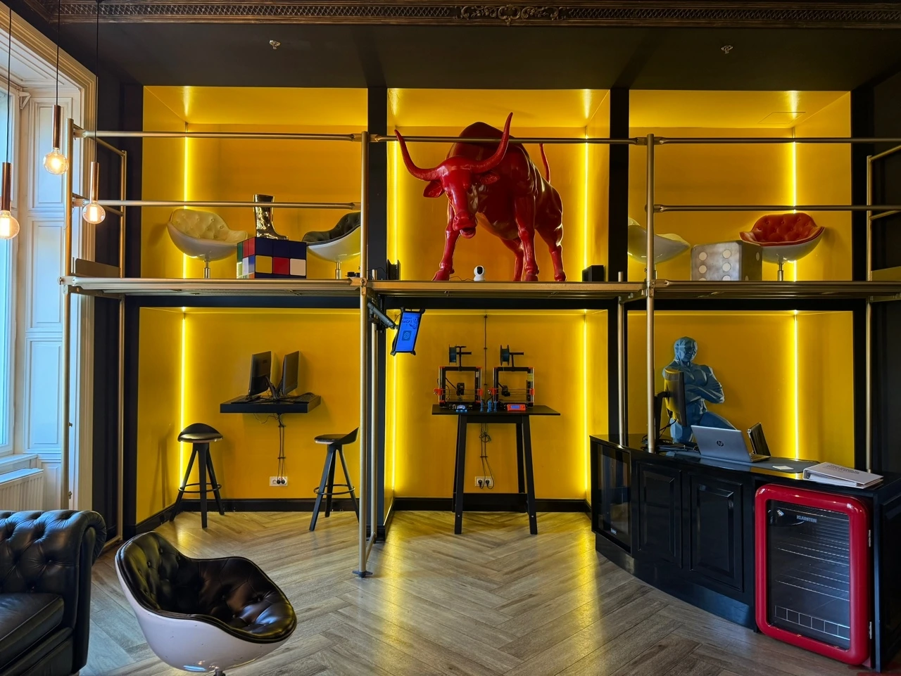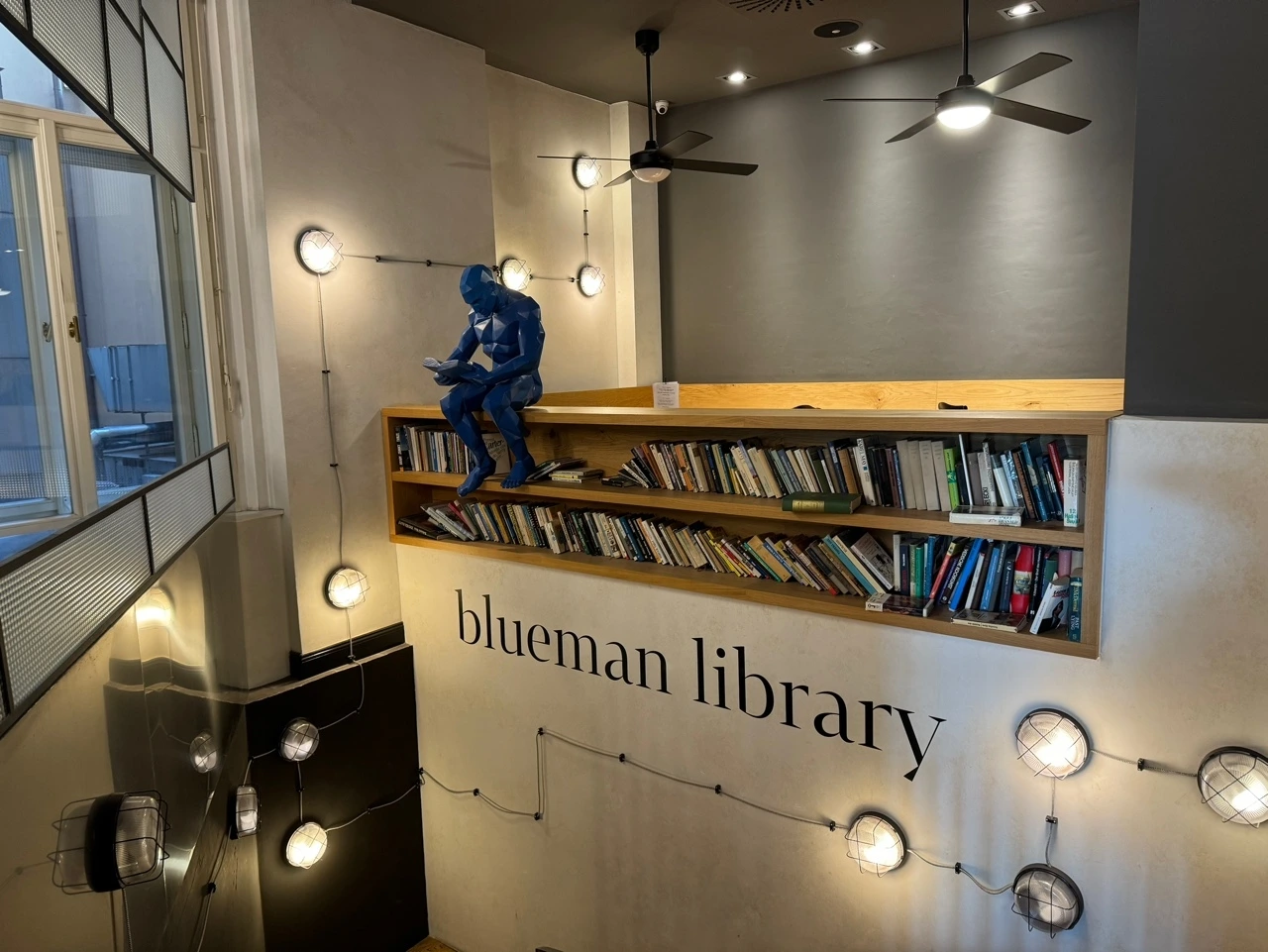 호텔 출입구에 3D프린터로 디자인된 사람모양의 파란 인형이 눈길을 끌었다. 이 친구가 이 호텔의 콘셉트를 알려준다. 엘리베이터 안에도 큰 친구가 있었고, 조식 식당의 책장에도 블루맨 라이브러리 선반에도 있었다. 표정도 동작도 제각각이어서 슬며시 미소 짓게 만들었다. 같은 일을 하더라도 이왕이면 재미를 추구하는 혁신적인 생각들이 세상을 아름답게 만든다. 이 인형의 이름은 blueman 아주 심플하게 재미있다. 리셉션에도 인테리어나 디자인 구도가 아주 앙증맞고, 젊은 사람들의 감성을 잡을 만한 혁신적인 내용들로 디자인되어 있었다.