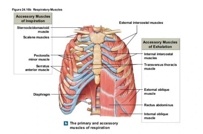 횡경막은 가장 중요한 호흡 근육으로, 갈비뼈 안쪽에 돔 형태로 부착되어 있다. 들숨 시 횡경막이 수축하면서 아래로 내려가고, 이때 복부 근육들이 이완된다. 날숨 시에는 횡경막이 이완되어 위로 올라가며, 복부 근육들이 수축한다. 늑간근(갈비뼈 사이 근육)들도 호흡 시 협력하여 움직인다.