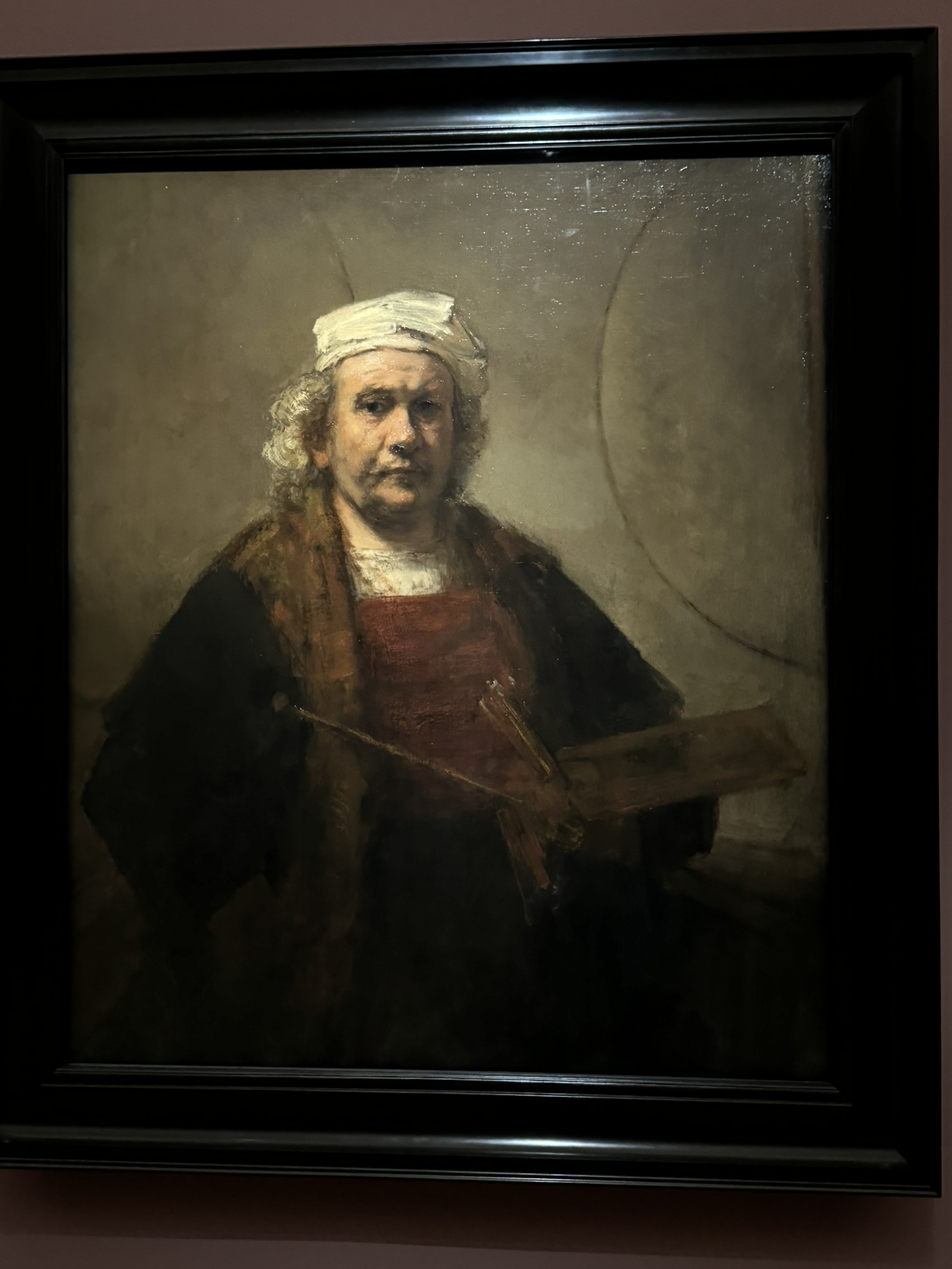 렘브란트의 자화상 앞에 다시 와 섰다. 이번에는 세월이 흘러 후기에 그린 자화상과 같이 들여다본다. 젊은 시절의 멋진 옷과 자신감 넘치는 표정과 나이 들어 여전히 그림을 그리고 있는 그의 모습은 어쩐지 쓸쓸해 보인다. 렘브란트는 생애 동안 약 80점 이상의 자화상을 남겼는데, 그의 자화상은 단순한 자기 묘사가 아니라, 자신이 처한 사회적, 경제적, 심리적 상태를 반영하는 "시각적 일기"와 같았다고 한다. 젊은 시절의 렘브란트 자화상은 자신감과 야망을 드러내지만, 나이가 들수록 그의 그림은 주름진 얼굴과 어두운 색조를 통해 세월의 흐름과 인생의 무게를 표현한다. 그가 견뎠을 수많은 불행한 가족사적 사건들과 그의 경제적 위치와 무관하지 않을 것이다.